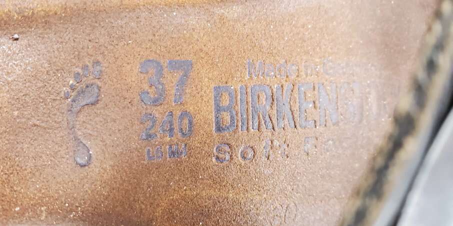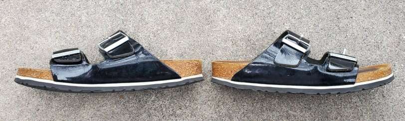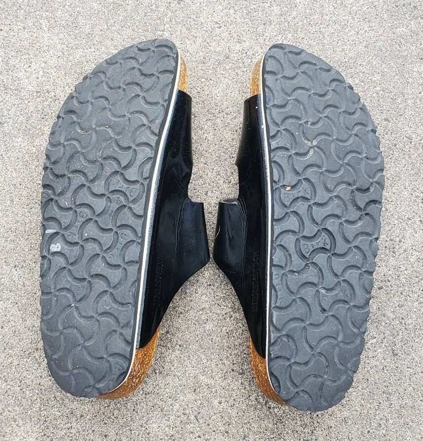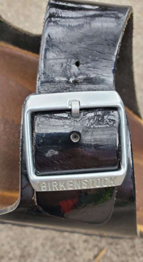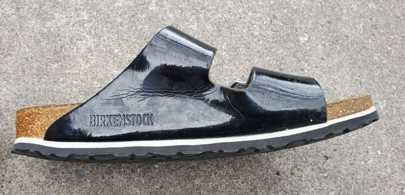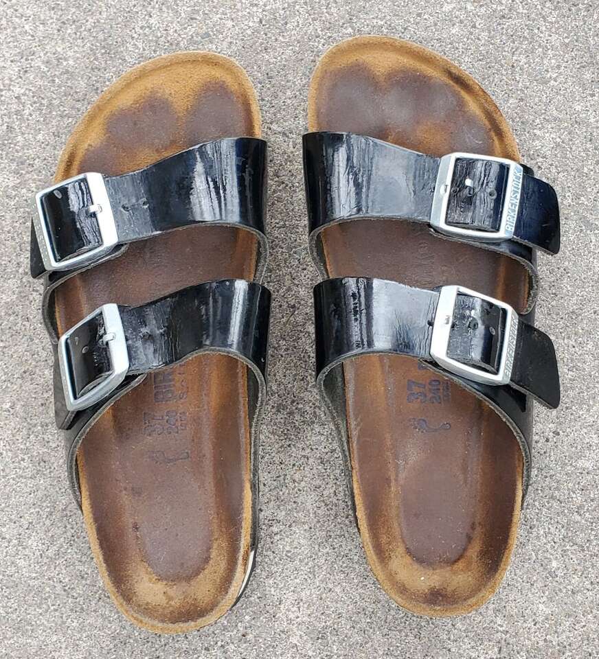 VenmoWomen's Birkenstock two-strap slip on Sandals with silver buckle accent. EU 37 or women's shoe size 6-6.5. The semi-exquisite footbed is fully lined with soft piumato leather, making it exceptionally comfortable. The upper is made from high-quality natural patent leather with a high shine finish. Made in Germany. Text please.