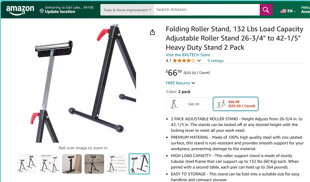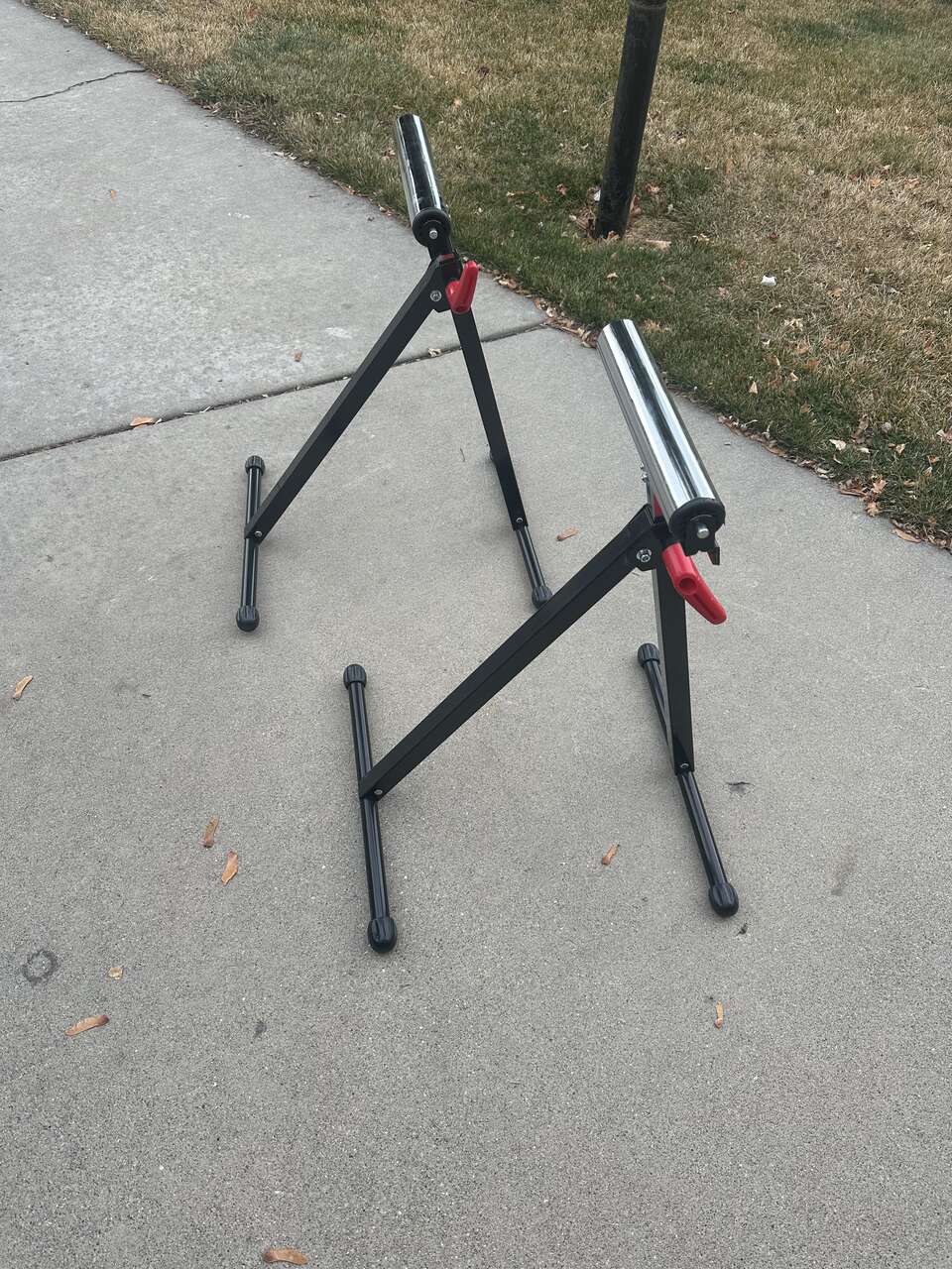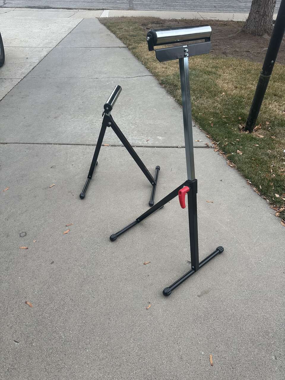VenmoBrand new (2 pack) heavy duty roller stands. They are light weight portable, folding and can be adjusted from 26-3/4" to 43" high. They are great for extending you table saw to cut longer objects or for any long wood or metal objects that need support.