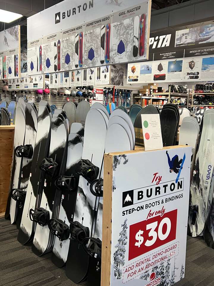 We carry new models from many brands including Burton (add a step on binding/boot for just $30), Capita, Ride, K2, Bataleon, Salomon, Never Summer, Bataleon, NIche, Nitro, Nidecker, and more!