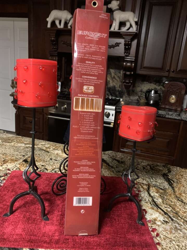 Euronext 18” clip in human hair extensions. Blonde Frosty color. 8 pieces with clips and then there are twi one inch wefts without clips for color testing. See back Of package for sizes of wefts. New never used. $49.