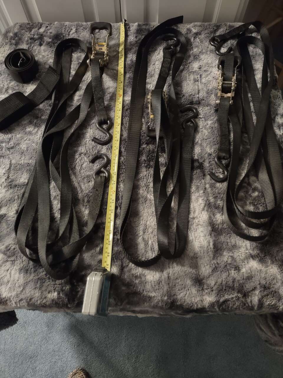 VenmoTHREE 13 FOOT X 1 INCH CORDED STRAPS WITH TIGHTENING WINCH AND TWO 3.5 inch metal hooks. $7 each or 3 for $18. ALSO two 2-inch wide corded strap. One 8 ft long and One 4 foot w/buckle.$2 each. Cash/Venmo. In Sandy. New and Like New. 801-201-5350.