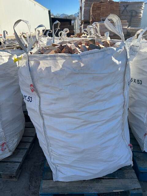 Mostly 2x4 cut to firewood size blocks. Nail free. Bags are about 1 cubic yard. We have a forklift to help with loading. They likely weigh around 1,000 lbs.