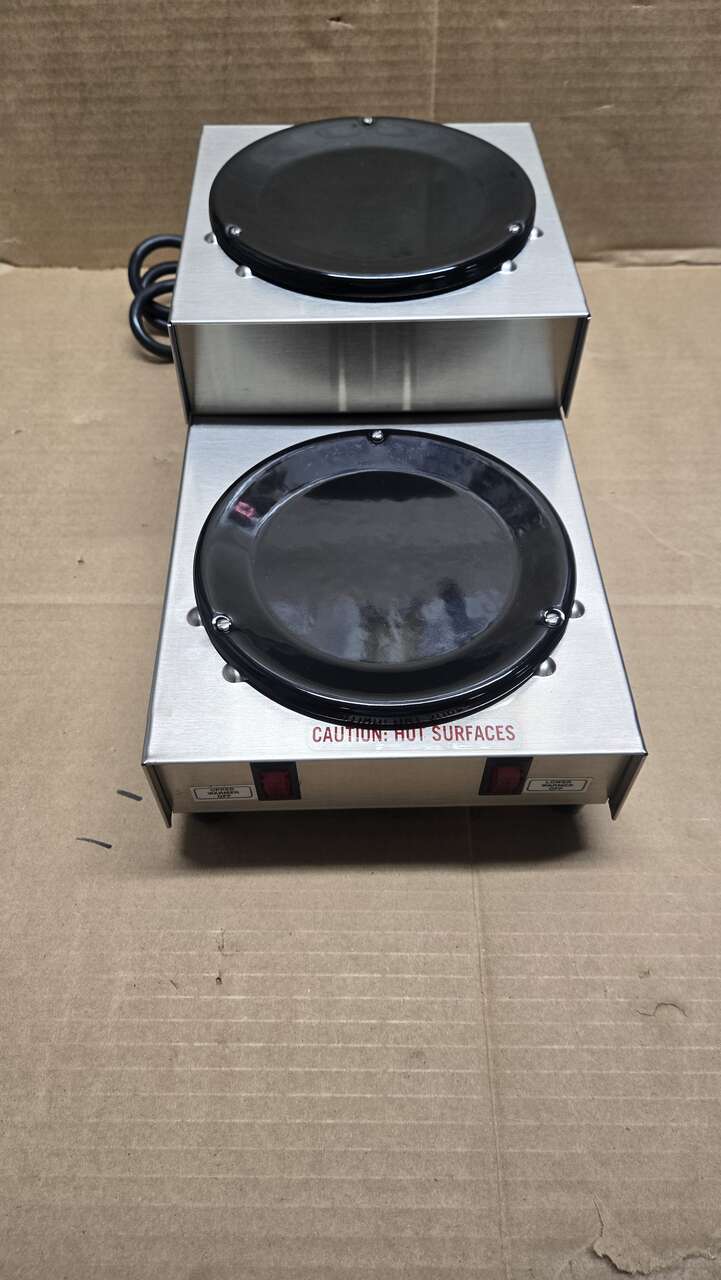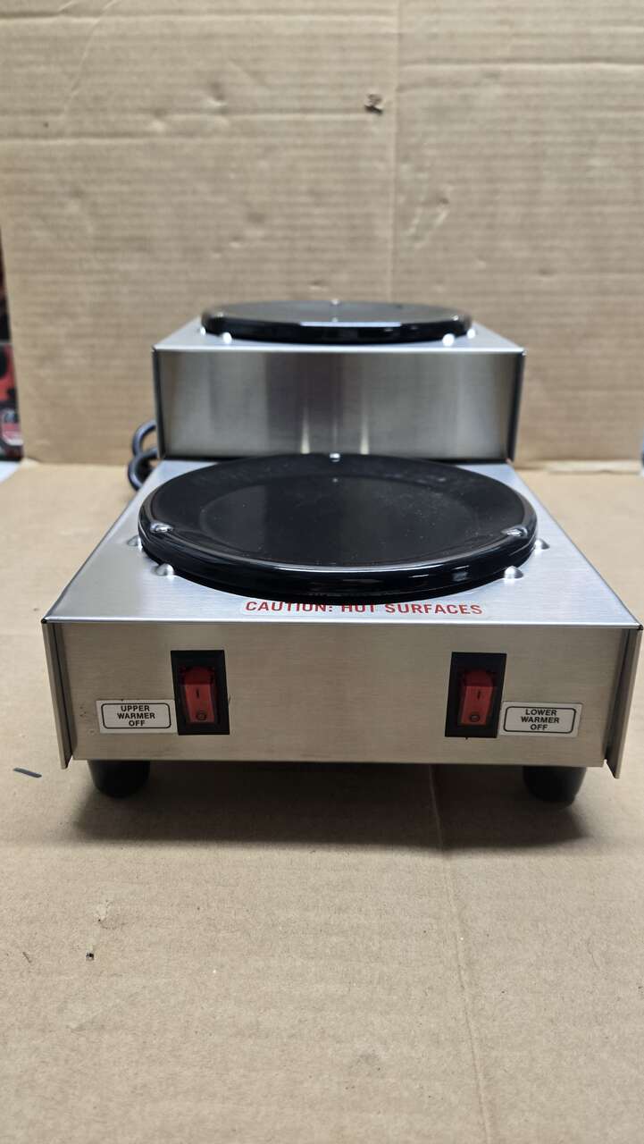 • Two tier warmer. • Stainless steel construction for durability. • Low profile design to fit on any counter-top. • Independent on/off switch for each warmer. • Porcelain enameled warmer plate positions coffee pots securely. • Dimensions: 5.5″ Height x 7″ Width x 14.5″ Depth