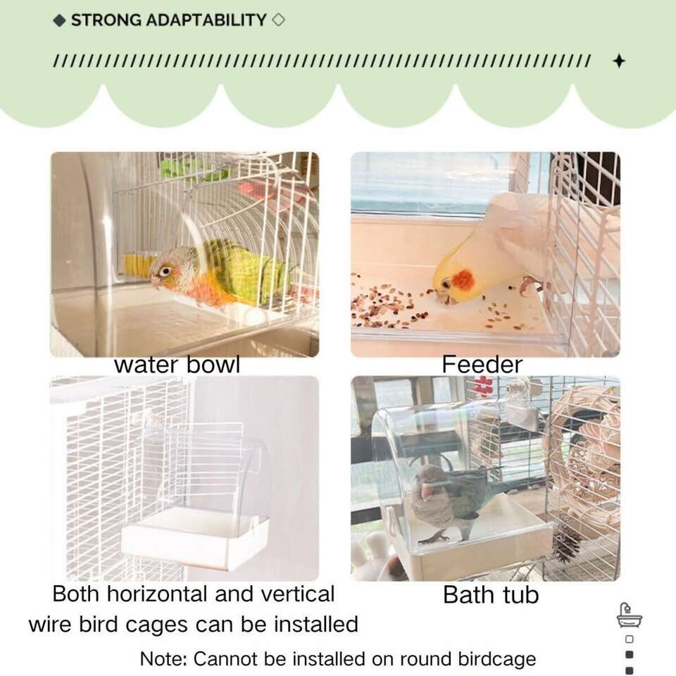 Suitable for small and medium-sized birds such as Budgie Lovebird Cockatiel and White Java sparrow Bottom drawer one pull to get out. Not only can be used as bathtub but also as feeder and Breeding box. Fully transparent observation safe and healthy Easy installation suitable for most bird cages. (The bathroom is suitable for hanging on a bird cage with a line diameter of 2.2mm.