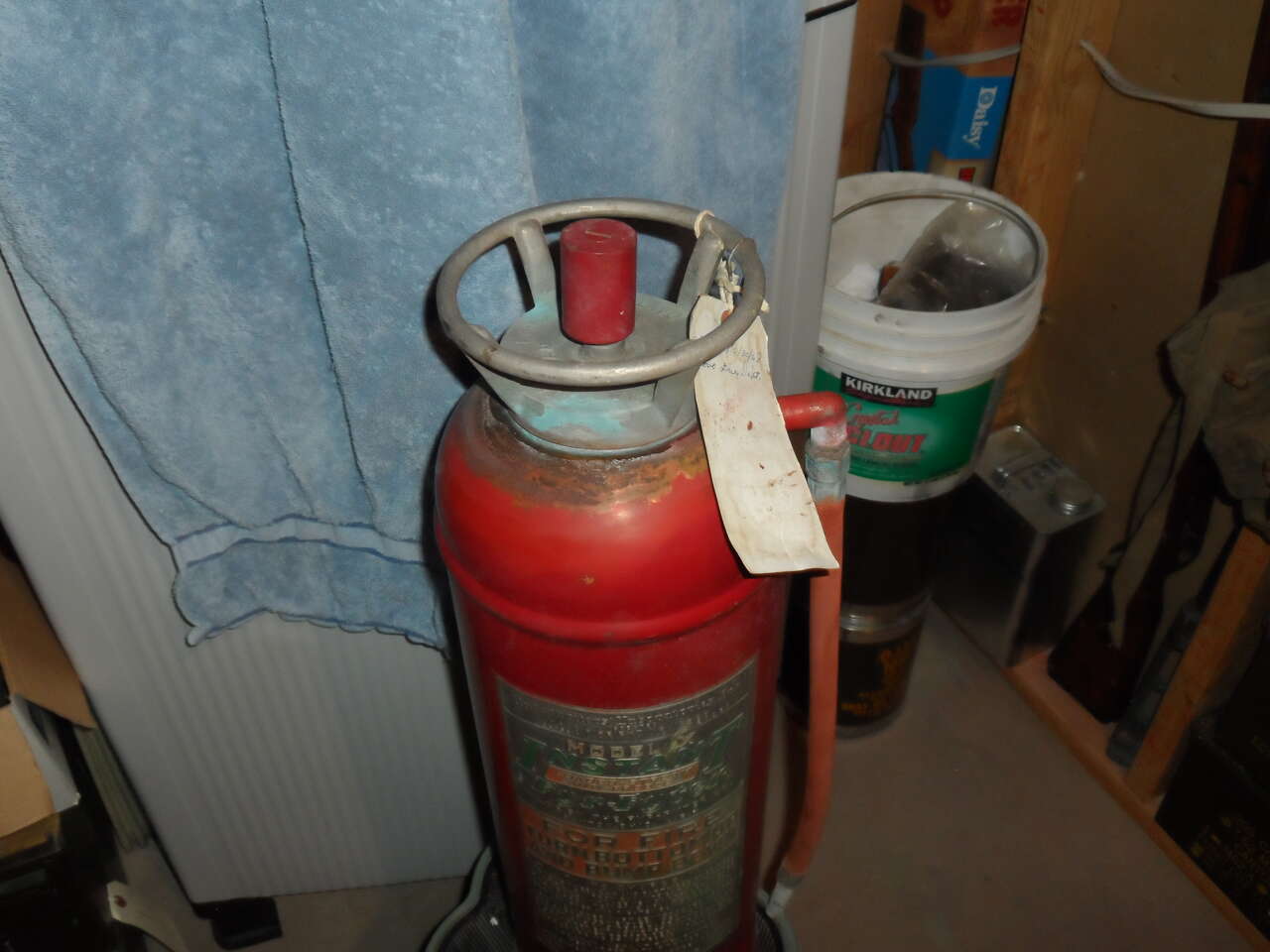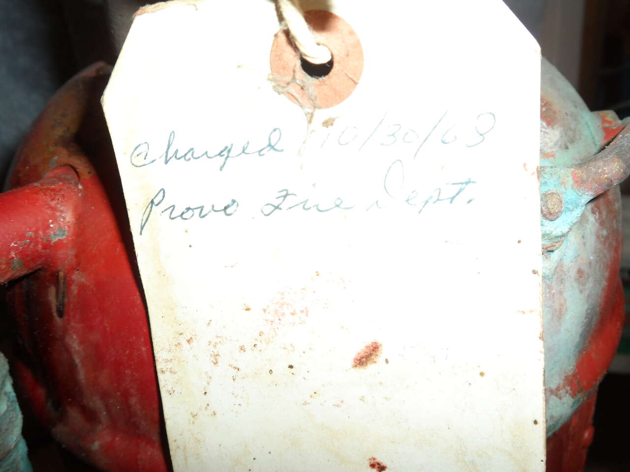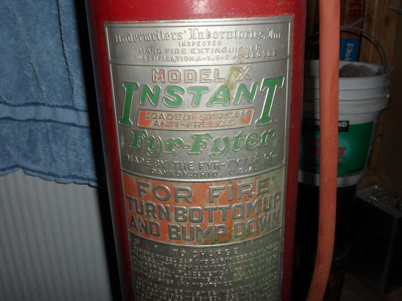 Age unknown. This is a MODEL X, INSTANT FYR FYTER extinguisher. The weight is 48 lbs, leadig me to believe it is not empty. Underside has the carrying handle once it is turned upside down. Looking at the RED cap on top it is higher then the ring at the top. I assume that when you tip it upside down and put weight on it, it then charges the extinguisher ( if working properly). I cannot verify that this is a working extinguisher only that it appears to be in very good shape. The white tag attached reads...charged 10/30/68 Provo Fire Dept, other side is signed E Saggr or Jaggr,,,,not sure which it is.