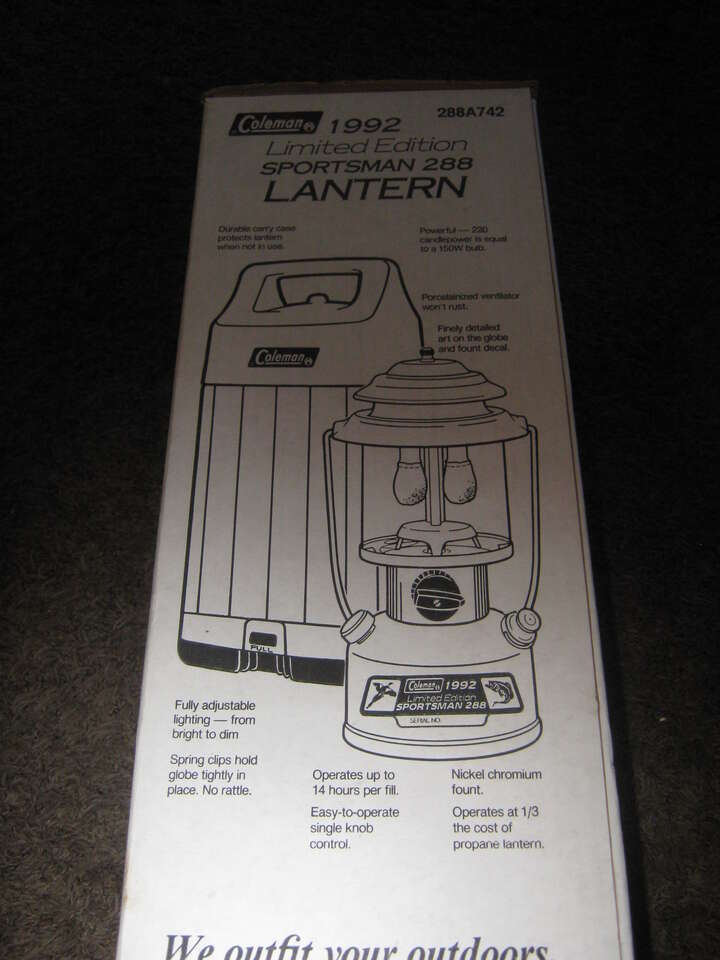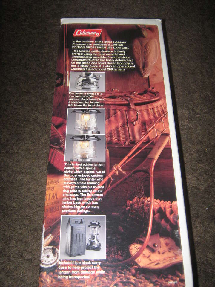 1992 Limited Edition 1992 Sportsman 288A742 A Maximum of 8,000 produced Each Lantern Seria Numbered Globe is Etched with Fisherman Hunter and Dog>> Nickel Chromium Fount ( TANK ) Comes with Carry Case.This Lantern has been in my collection for 33 years> Been out of the box once. NEVER Fired >Their R 4 of these on E Bay Going for 500.00 to 900.00> I'am asking 400.00