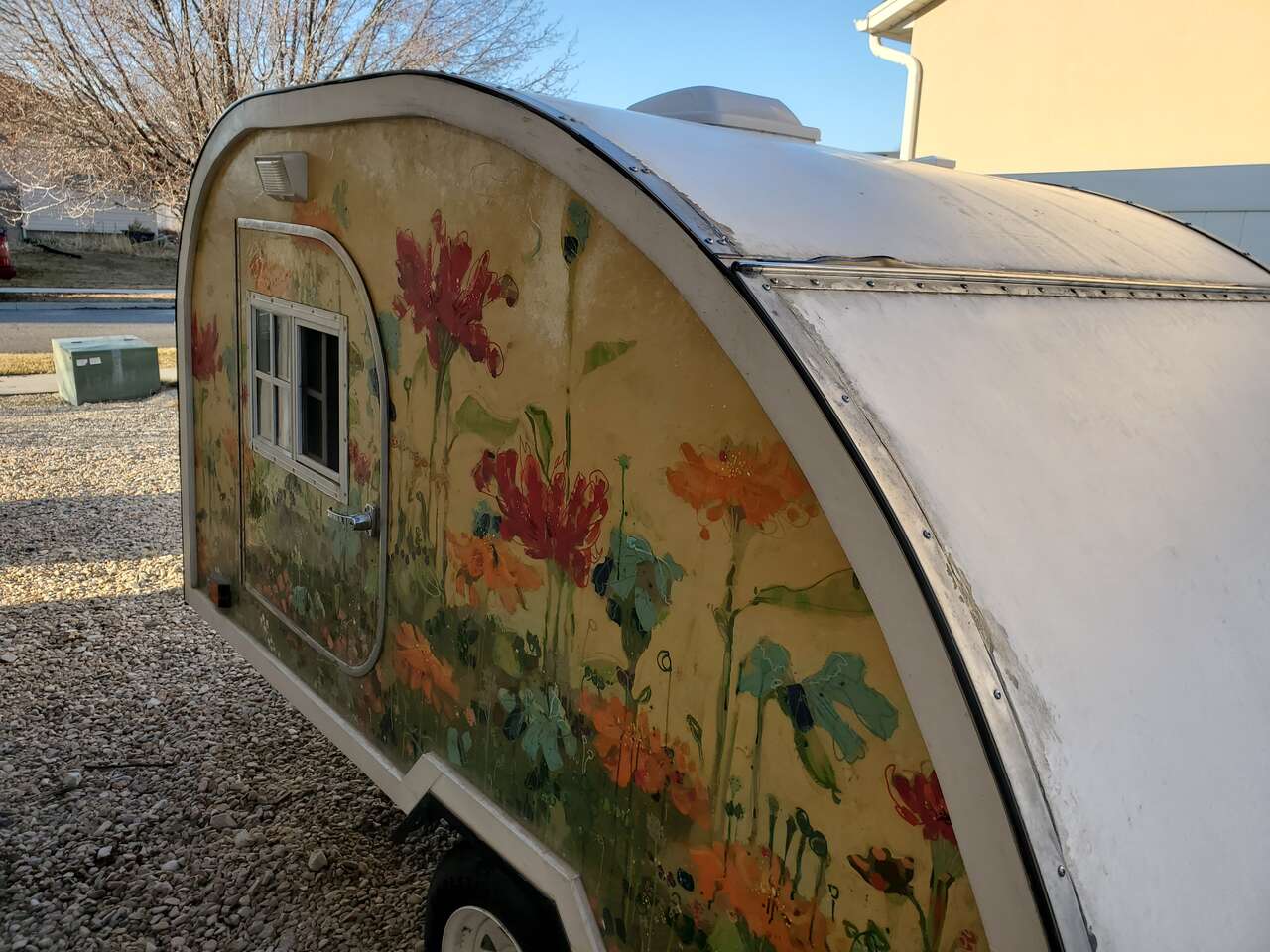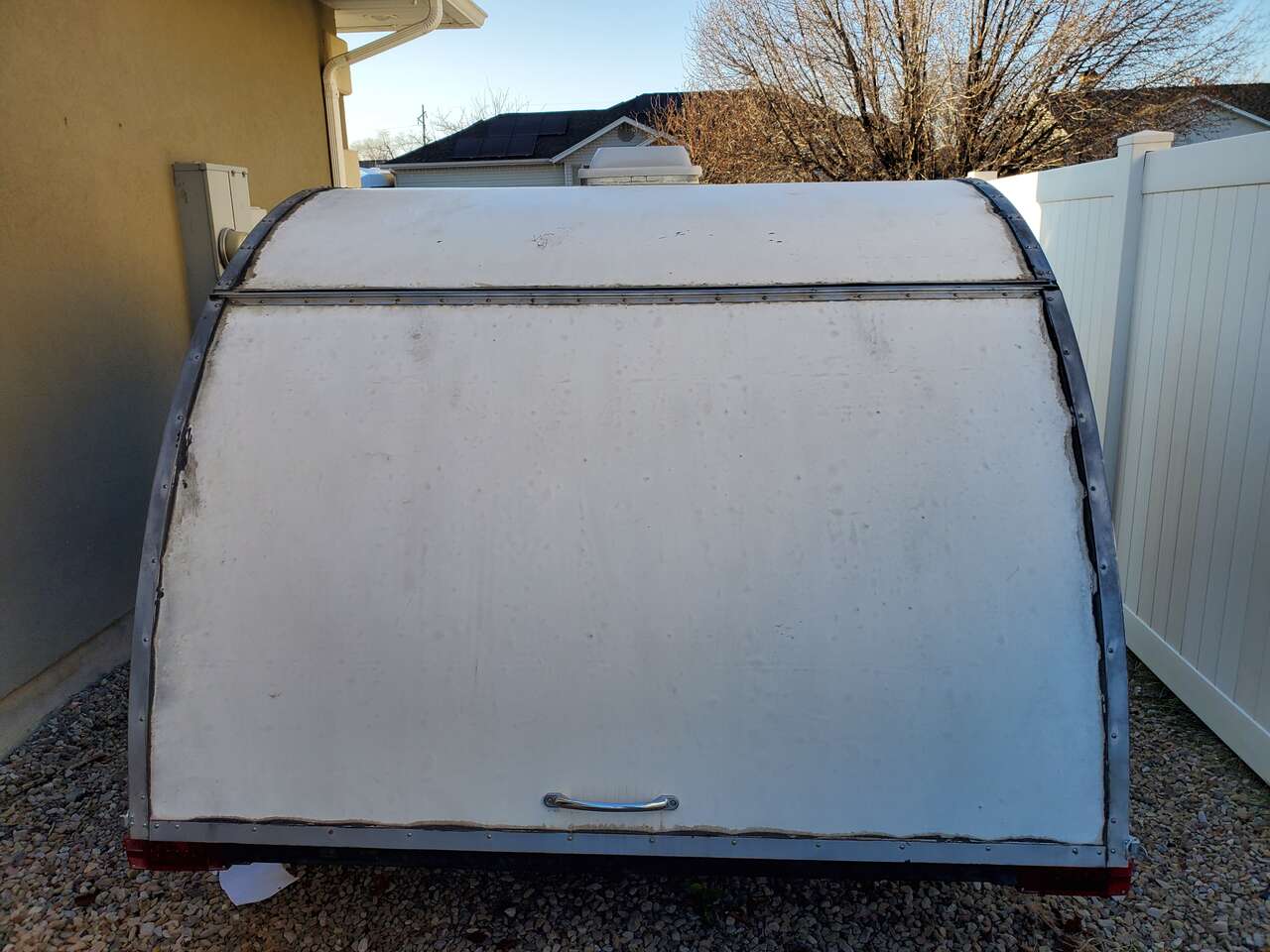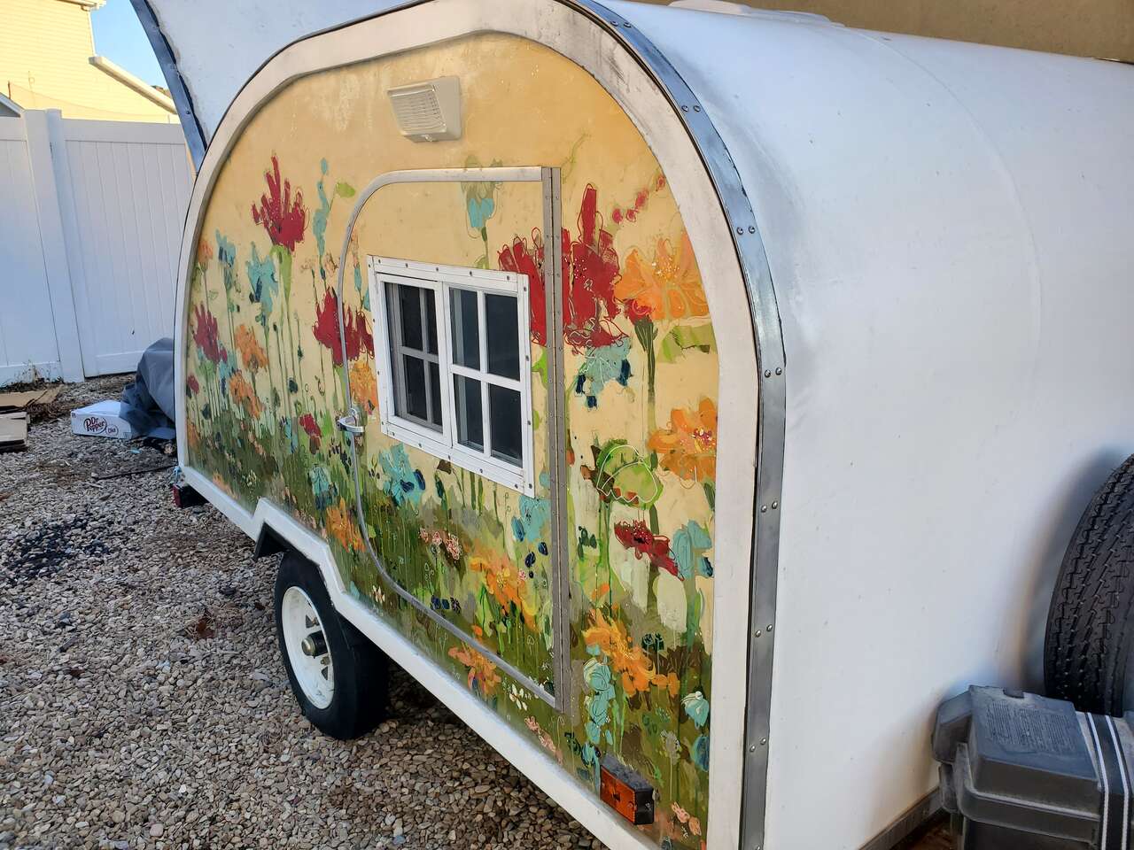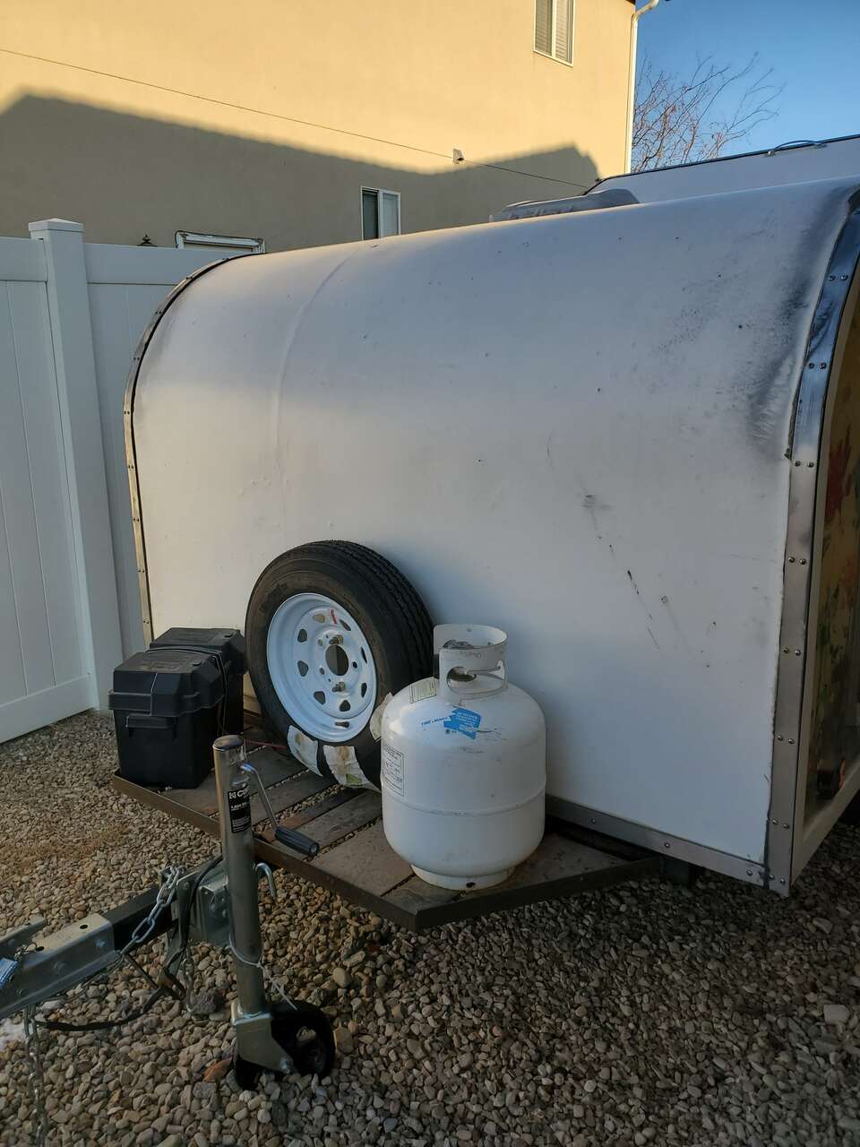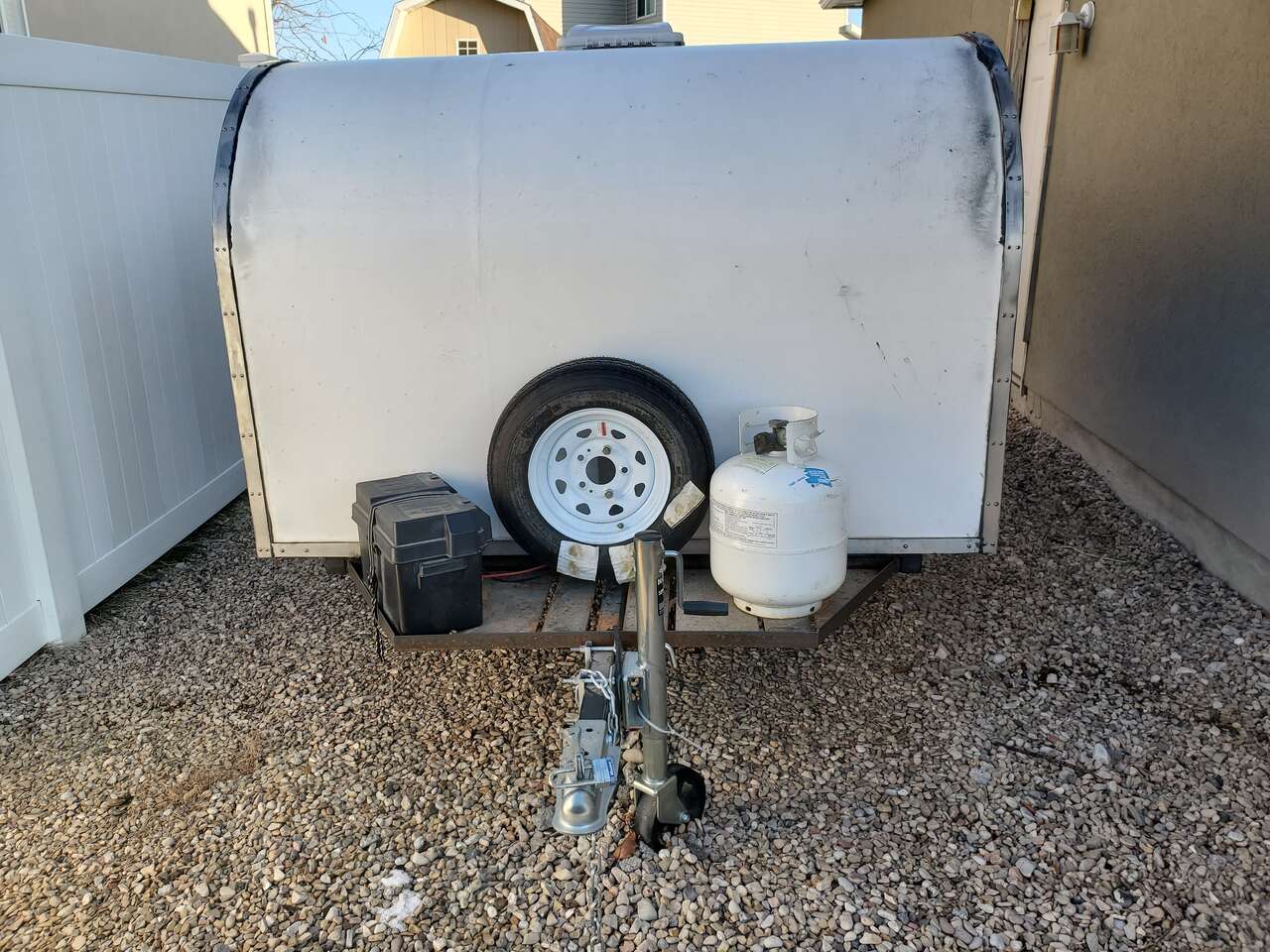 PayPalCustom made teardrop trailer for sale! This charmer is built on a new 6'x8' NorthStar trailer using plans provided by https://bigwoodycampers.com. Interior sleeping space is a roomy 6'x6', with plenty of headspace for two adults, or even 3 kids. Large cubbies sit above the foot space in the interior of the cabin for luggage and totes, with smaller overhead cubbies equipped with charging hookups for phones and electronics. There is a small ledge shelf built in above large cubbies for easy viewing of phone/tablets screens on rainy days or late nights. Interior and exterior lights all work using LED's for minimum battery usage. Custom welded exterior tray for propane tank, battery and spare tire. The back of the camper has a hatch that reveals built in storage cubbies, a counter and a sink. Plenty of storage, along with food prep area and convenient clean up. The exterior of the camper has been custom painted and is sealed with multiple layers of boat epoxy. Doors on each side of the camper have functioning windows if you want a cross breeze in the summer, aided by the vent with fan in the ceiling. Camper has PVC exterior coating, chosen for its durability and longevity. Lightweight (1500 lbs) and easy to pull by any vehicle with a hitch hookup, the camper is ready with all required road signal lights. This camper is one of a kind! Battery and battery inverter included.