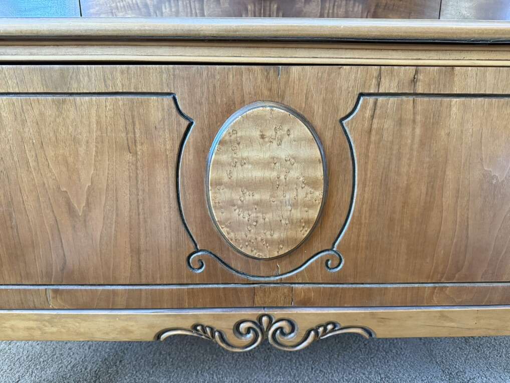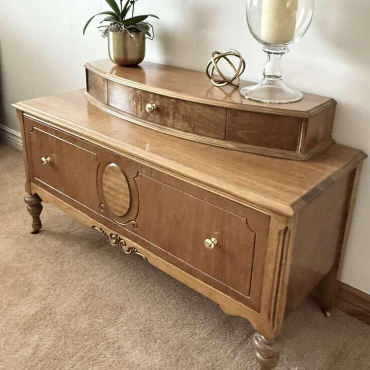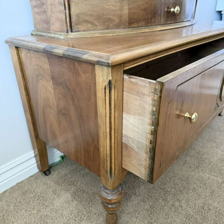 VenmoBeautiful antique two tier accent chest from the early 1900s. Gorgeous wood details. Dovetail drawers. Both drawers work very well. Original rolling caster wheels that work great. We stripped the old paint, sanded and varnished the table to reveal its original beauty and character. Has some minor flaws where the wood chipped on the front, but it’s been sealed and looks great. It adds to the charm of this antique table. Measures 28”H x 46”W x 18”D.