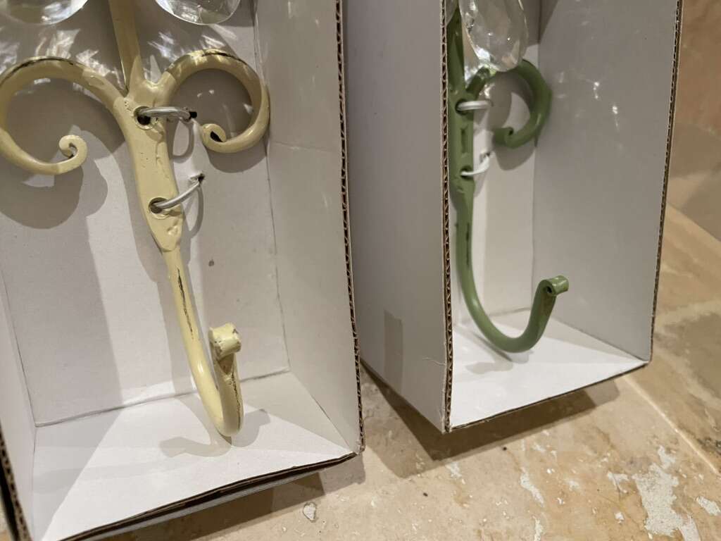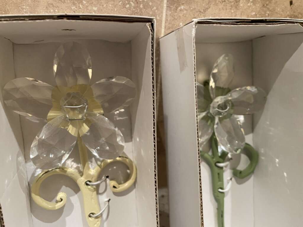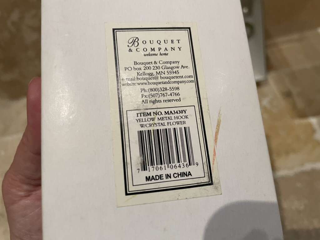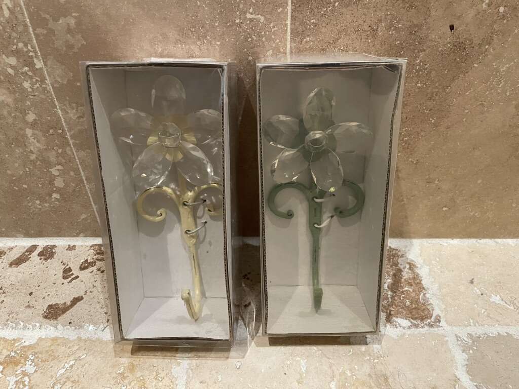 I have 2 new large metal hooks with crystal hooks. They are still in the boxes and were made by Bouquet & Company. They are about 7 inches tall and 3 inches wide. One has an off white hook and the other is sage green. The flower petals are clear. The price is for both of them together. See my other ads for jewelry, artwork, home decor and more.