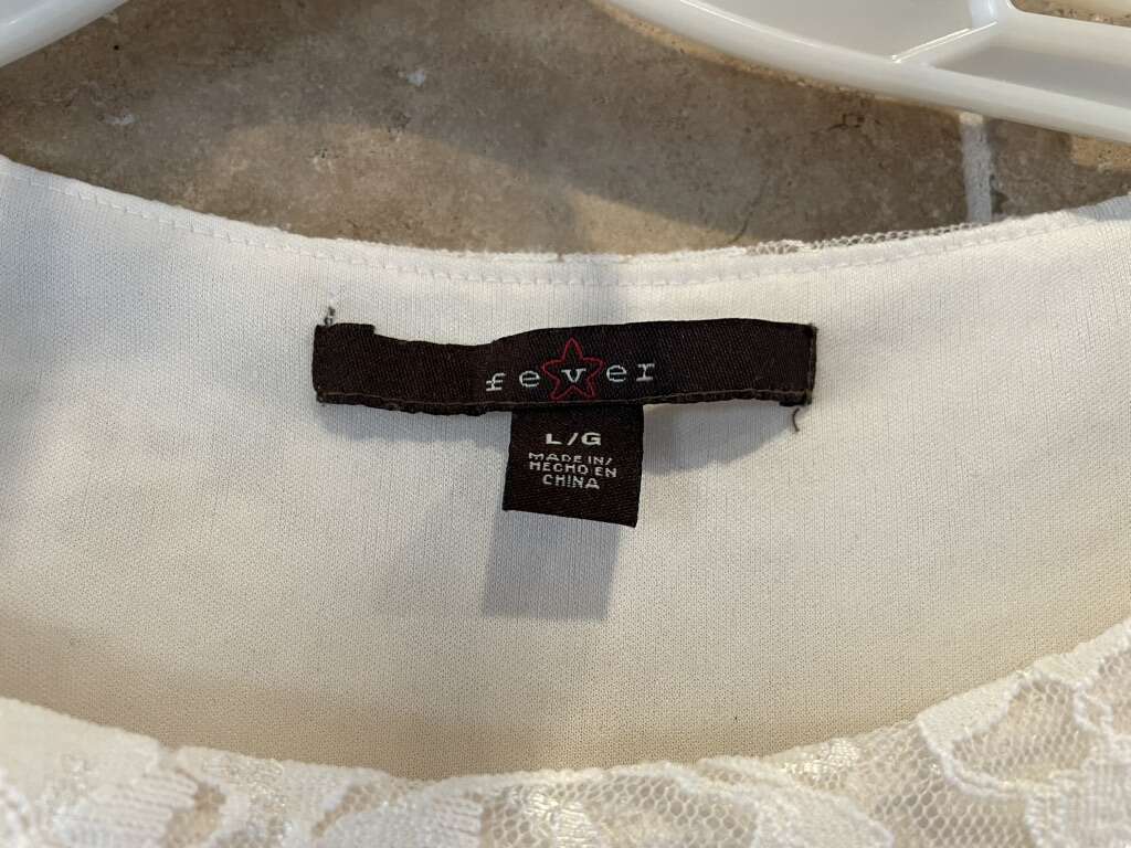 I have a white lace top by Fever. It has a white attached tank top liner inside. The sleeves are not lined. It is a size large. See my other ads for jewelry, artwork, home decor and more.