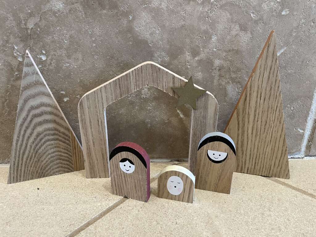 I have a simple little wood nativity with a crèche or stable with a gold star, Mary, Joseph, Jesus and 2 triangle trees. The tallest tree is 6 3/4 inches tall. Everything is in the original box. The price tag shows it was $14.95. See my other ads for jewelry, artwork, home decor and more.