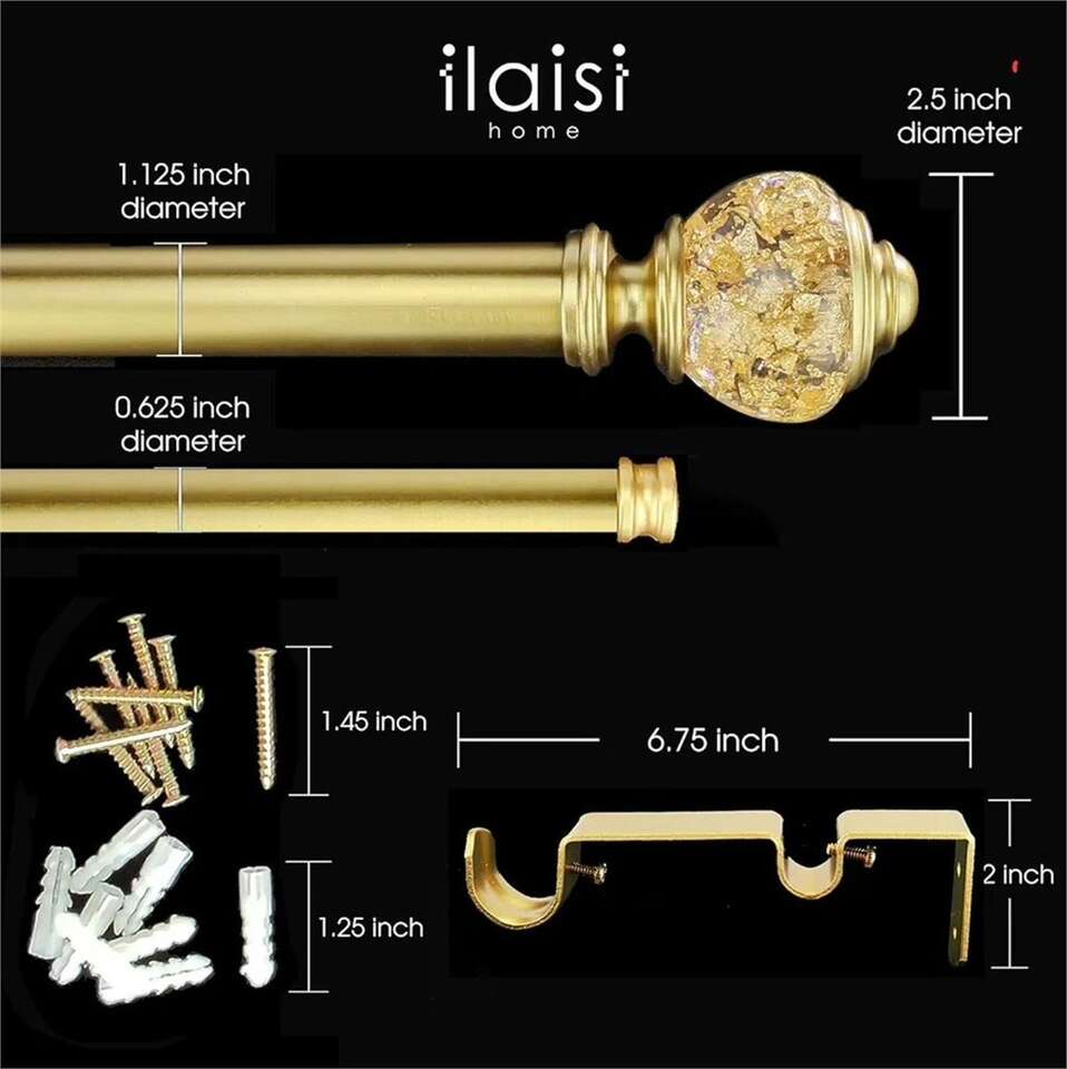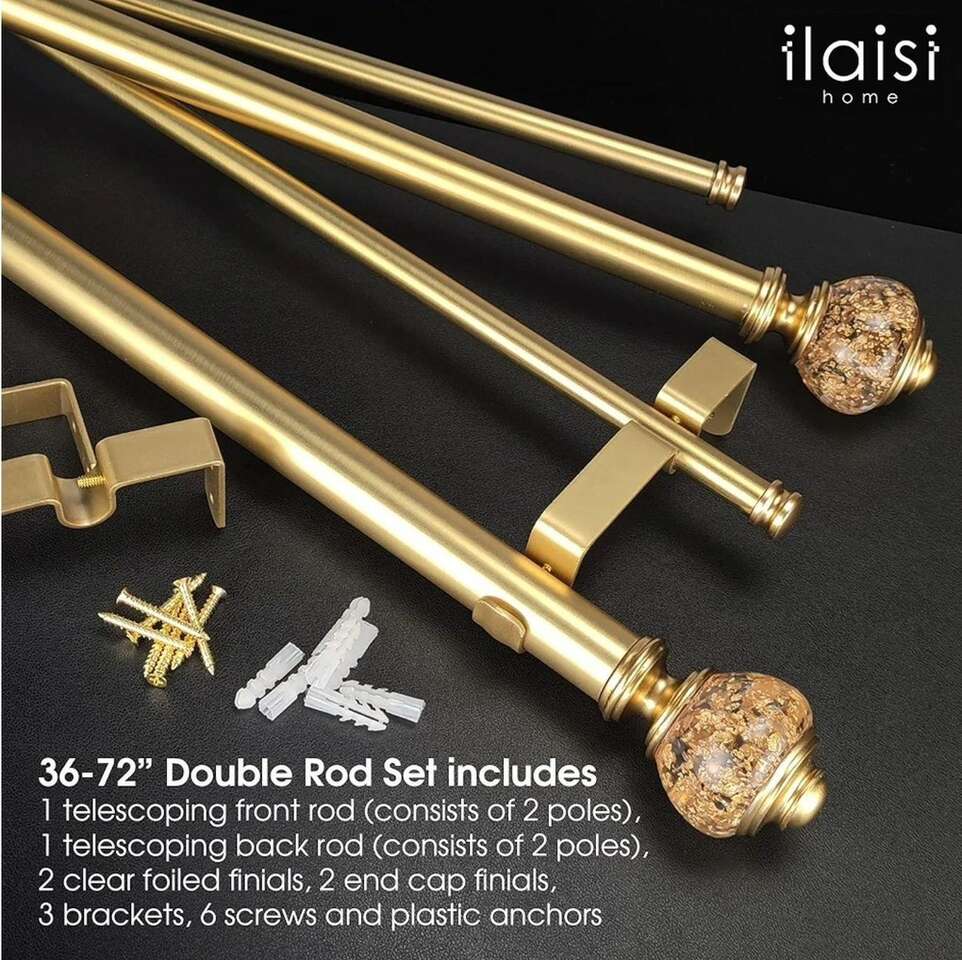 Double Curtain Rod Set:1-1/8 Inch Diameter, Gold Curtain Rods, 36-72 Inches Adjustable Gold/Bronze Drapery Rod with Clear Foiled Finials for 1 Pack
