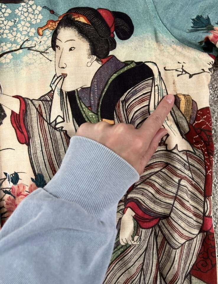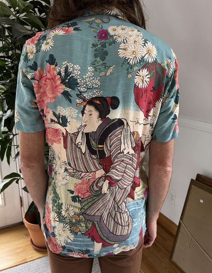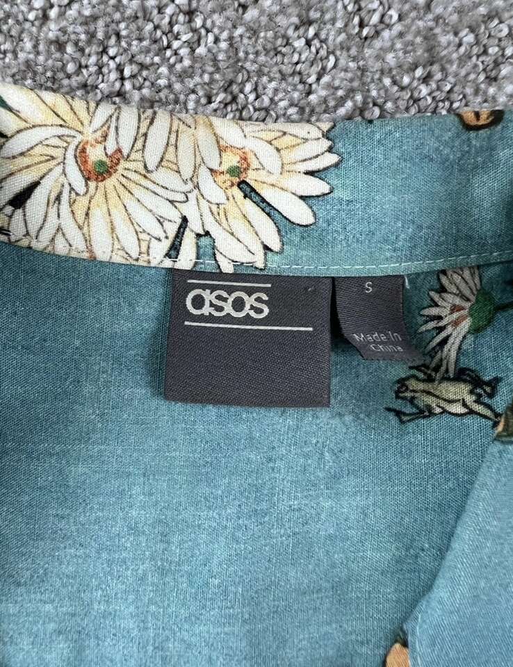 VenmoASOS Floral Oriental Button Up Top Size Small This is one of the coolest shirts my husband owns, but he prefers baggier clothes now. There is a small stain on the front that I didn’t even notice until listing. See last pic. Price reflects this. Paid $40. Cash or Venmo. Will hold with Venmo payment.