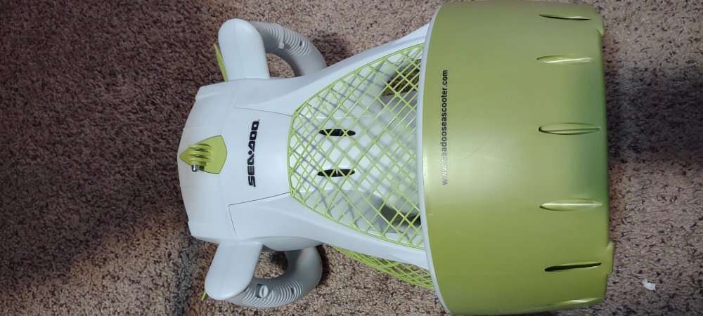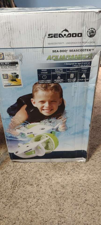 Sea Doo sea Scooter with underwater propulsion. Never been used, however, the battery won't take a charge. There's a crack in the seal battery lock to keep it shut. Otherwise it's new.