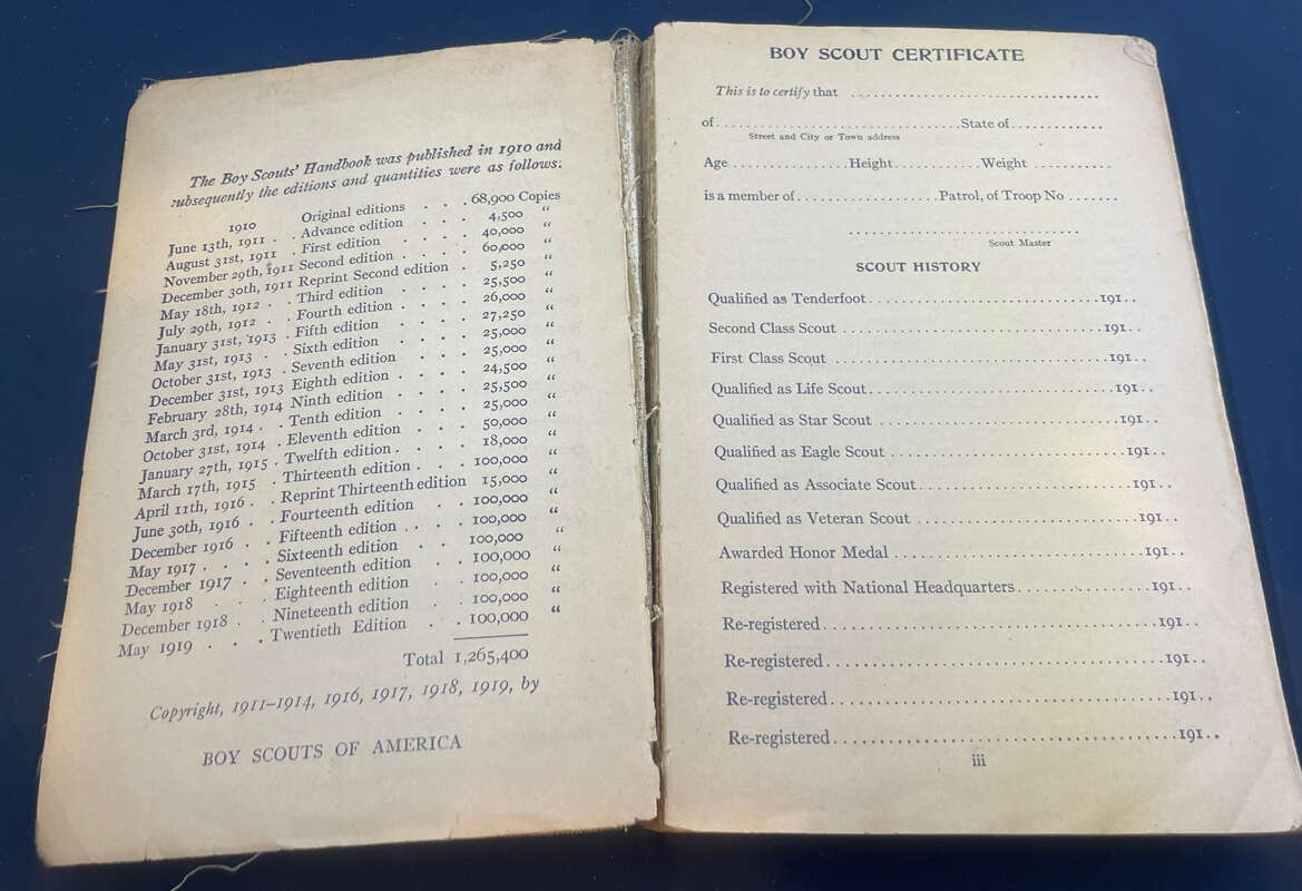 $80. Boy Scouts of America official handbook, published in 1919, 20th Edition. One of only 100,000 copies! Amazing condition for its age. Measures approx. 7" x 5". What a great old piece of Boy Scout memorabilia! Cash preferred. Pick up only in southwest Orem or American Fork.
