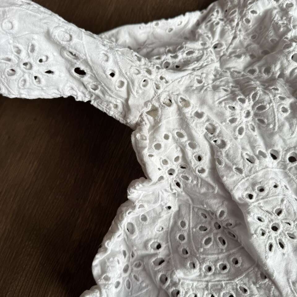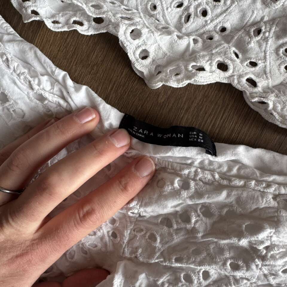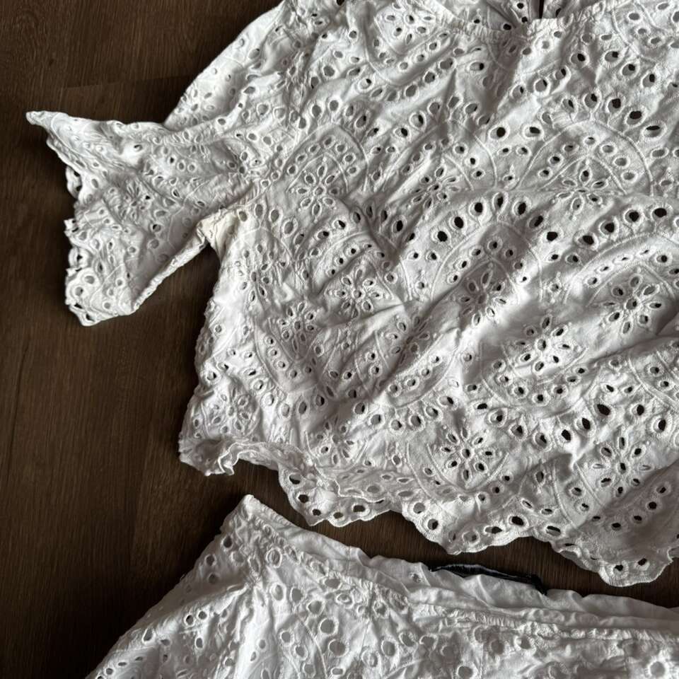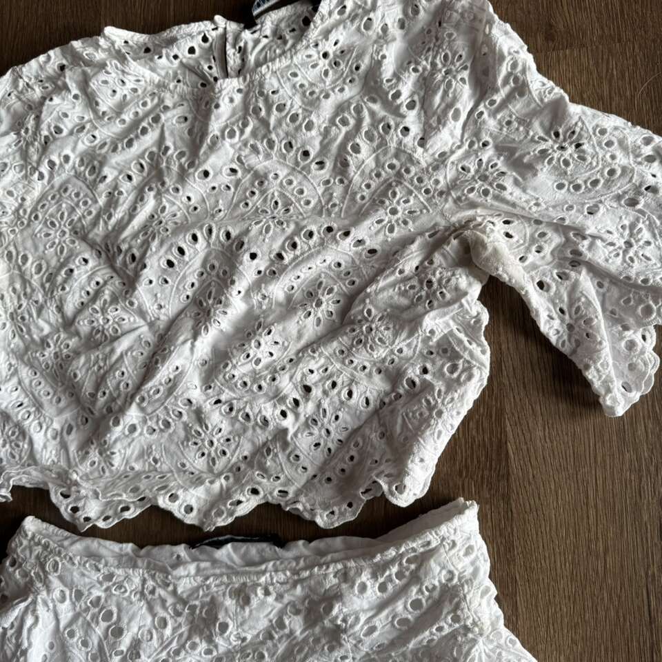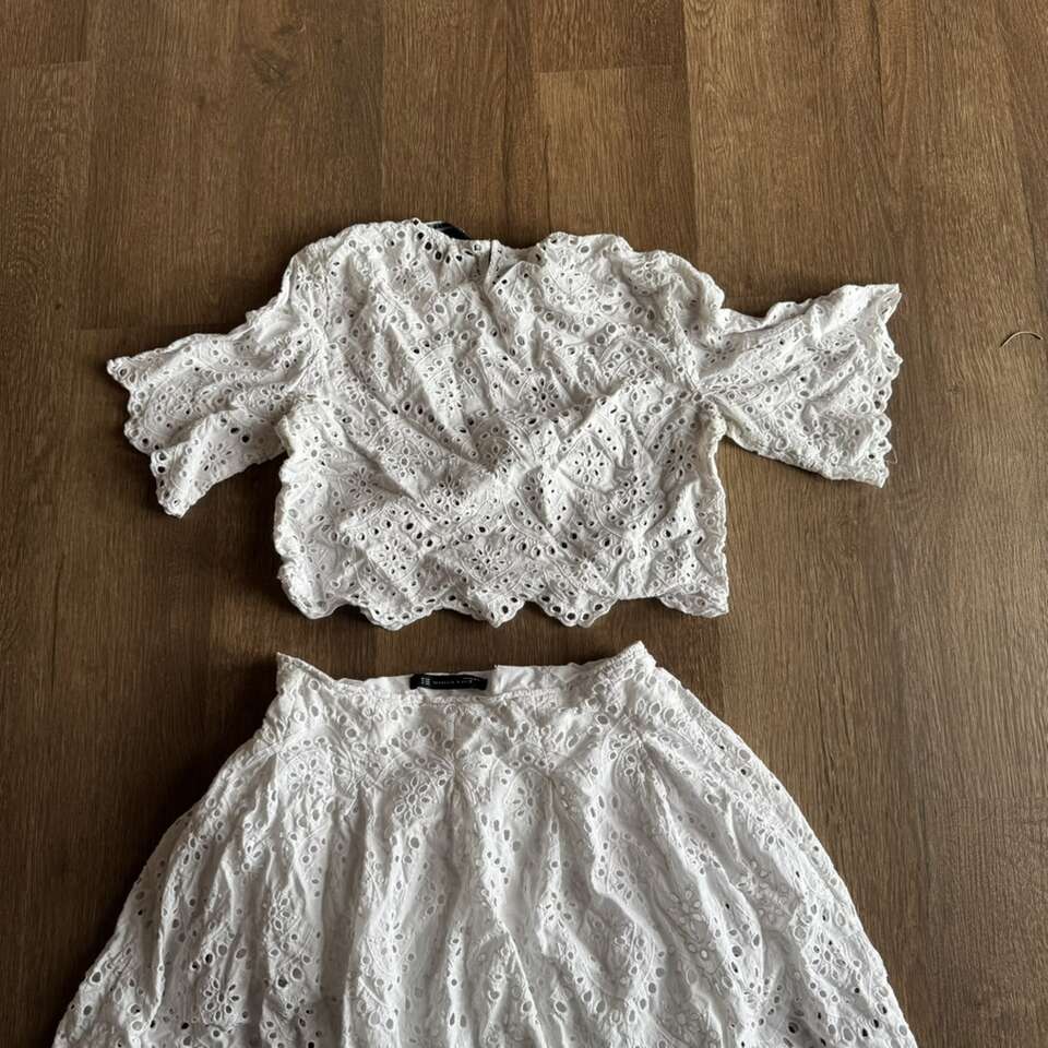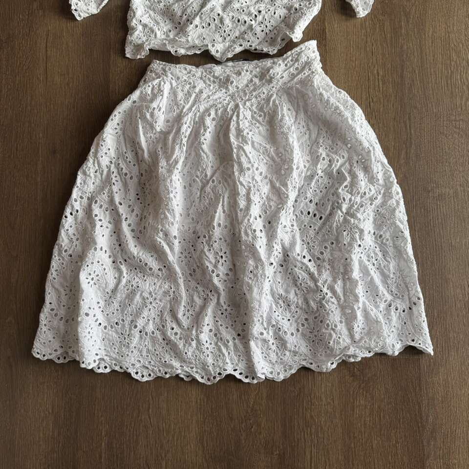 ZARA WOMAN White Eyelet Cut Out Lace Embroidered Midi Skirt & Top Size M It does have some underarm stains