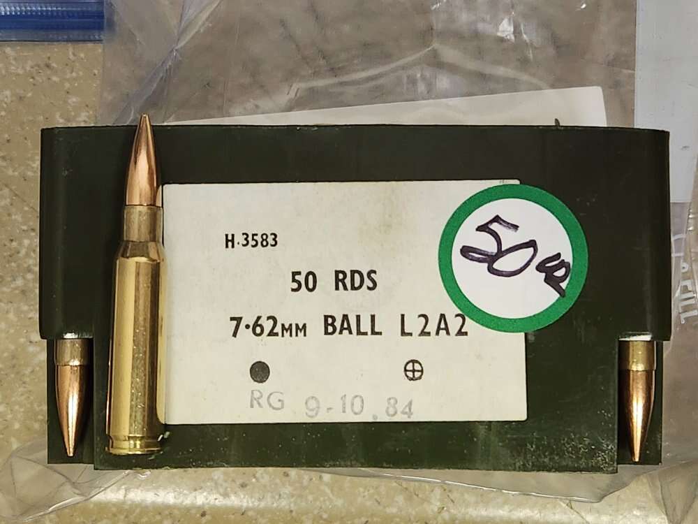 1984 manufacture British 7.62x51-L2A2 ammo. 100 rds available. 50.00 per 50rds. Excellent ammo, non corrosive!