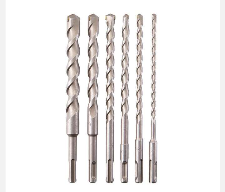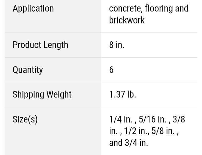 Comes with 6 drill bits (8 inch long, 6 inches of drilling) 3/16in, 1/4 in. , 5/16 in. , 3/8 in. , 1/2 in., 5/8 in. , and 3/4 in.