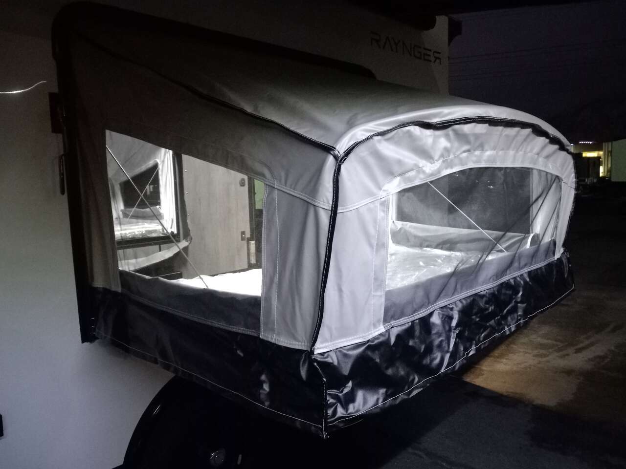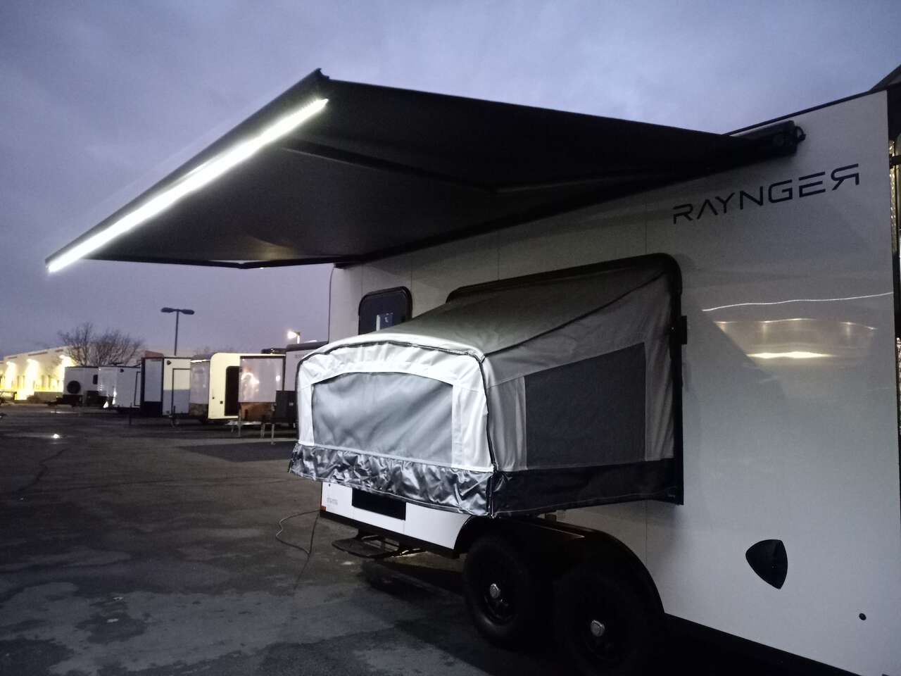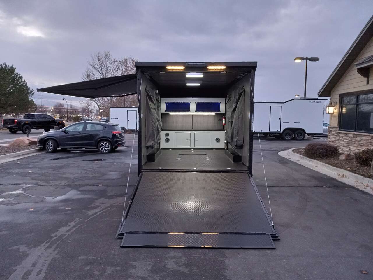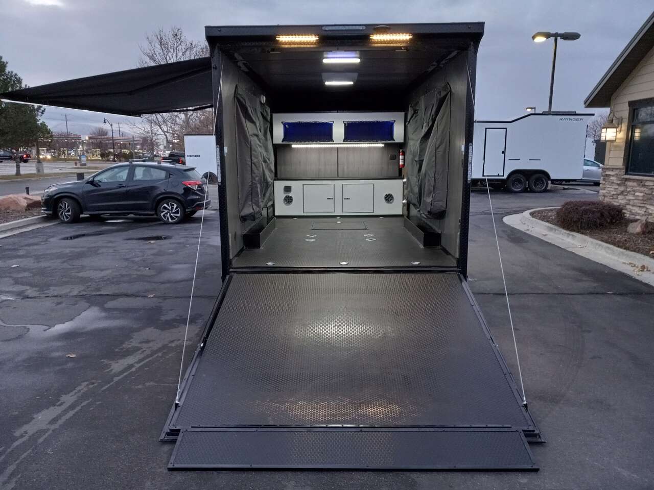 LIMITED TIME $259 A MONTH WITH ZERO DOWN WITH OUR SPECIAL LOCAL CREDIT UNION PARTNER!!! NO PRE-PAYMENT PENALTIES!!! NEW 8.5 WIDE MODEL!!! WILL FIT ANY STOCK SIDE BY SIDE UTV!!! RAYNGER PREMIUM OFF ROAD TOY HAULER CAMPER!!! 18 INCH GROUND CLEARANCE!!! OFF ROAD TIRES!!! FULLY INSULATED!!! HEATING AND A/C!!! WET SOUND STEREO!!! TWO FOLD OUT/POP OUT TENTS WITH MATTRESS!!! CARGO BASKET!!! LED LIT AWNING!!! 87 Inch Rear Entry Height/90 INCH INTERIOR HEIGHT!!! 90 Inch Rear Entry Width!!! Aluminum Ventilated Locking Generator Box!!! UPGRADED 5,200# TORSION AXLES!!! 14.2 Foot Long Garage Space!!! And Much MUCH MORE!!! Check out our Specs!!! Also available in 18 foot models. 18 Foot Models can have 3 Fold Out Beds/Pop Out Tents. 16 Foot and 18 Foot Models will fit ANY stock 4 Seater Side by Side • 6” I Beam Frame• Flat Top Design• Flat Front Design• Wall Posts 16” on Center• Cross Members 16” on Center• Roof Bows 16” on Center• Rust Inhibiting Z-Tech Protection on Chassis• Ameraguard on Tongue• Ameraguard on Rear Bumper• Ameraguard Around All Door Openings and Stepwell• Ameraguard Around Edges of Ramp Door• 3500 LB Spring Axles• 2-5/16” Coupler• One-Piece Aluminum Roof• ST235/75R15 Aluminum Wheels with Chrome Center Caps• 2000# Ramp Door with Eberhard Latch• 30” Tempered Glass RV Door with Screen Door• .030 Exterior Metal with Screwless Sides• 24” Black Stoneguard• 3” Black Bottom Trim• Sand Pad• Black Door Hold• 2.7mm Charcoal Textured Vinyl Ceiling • 9mm Charcoal Textured Vinyl Walls• 3/4” Engineered Wood Floor with Rubber Coin Overlay• (6) 1200 LB Floor D rings Installed with Backer Plates• LED Clearance Lights and Tail Lights• LED Back-up Lights• No Show Wheel Box• Spoiler with Toggle Switch• RV Step• 7’ Interior• (2) 17” Chrome Base Lights with Switch• (1) Black 17” Spot Light with Switch• (1) 30 Amp Panel with Marine Plug• A/C Unit with Heat Strip• (3) Interior Recepts• (1) Exterior Recept• 12V Battery and Charge Line• Prep for Backup Camera• Wet Sounds System• (3) Blue Interior Cabinet Lights• (1) 6’ Section of Flex Lights• Black ATP Rear Header and Hoop• Black ATP Fenders• Insulated Walls & Ceiling• Base Cabinets• Overhead Cabinets with Netting Over Compartments• Pop Out Tent• Black ATP Storage/Generator Box Mounted On Tongue SW094231 SW094231