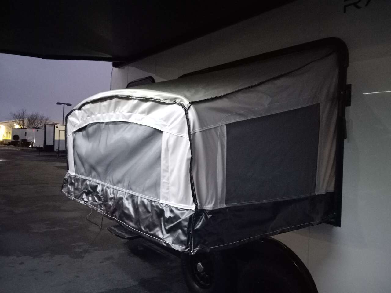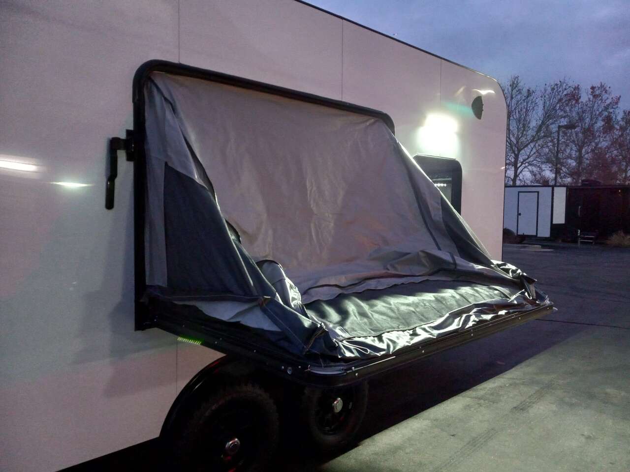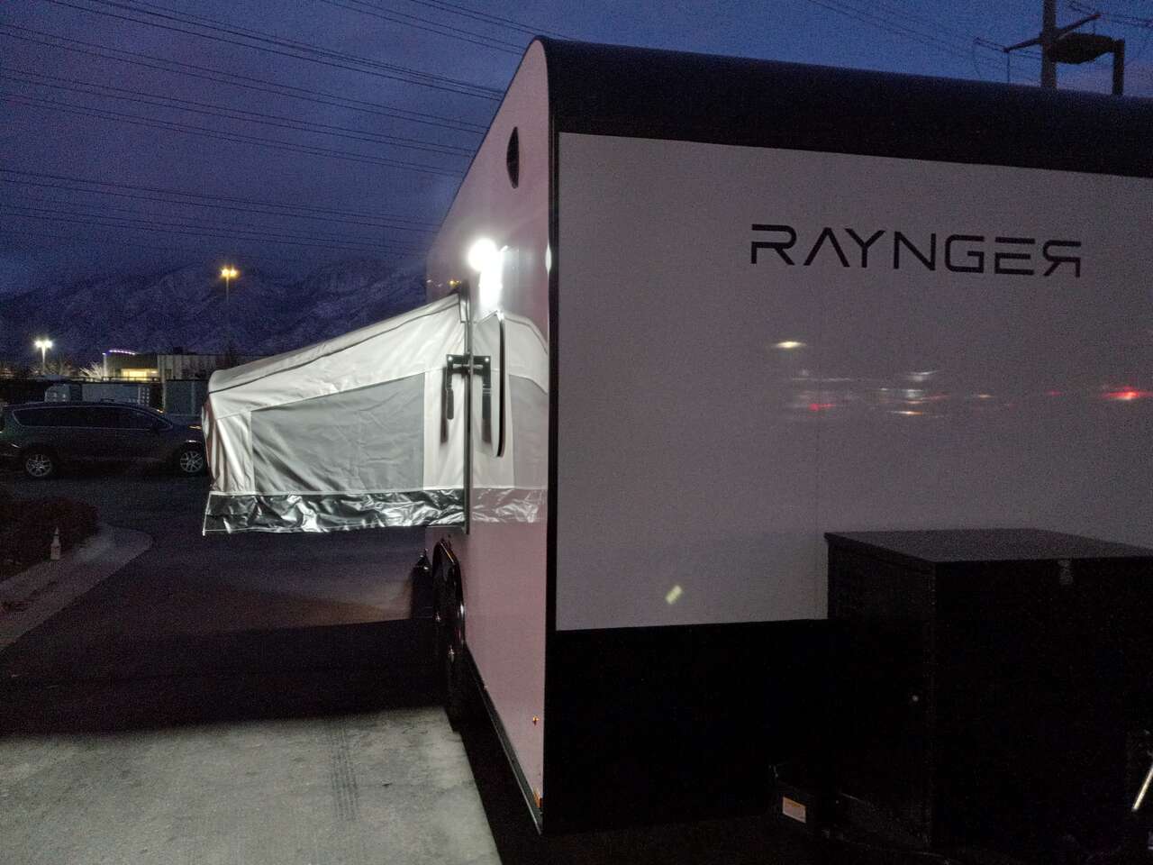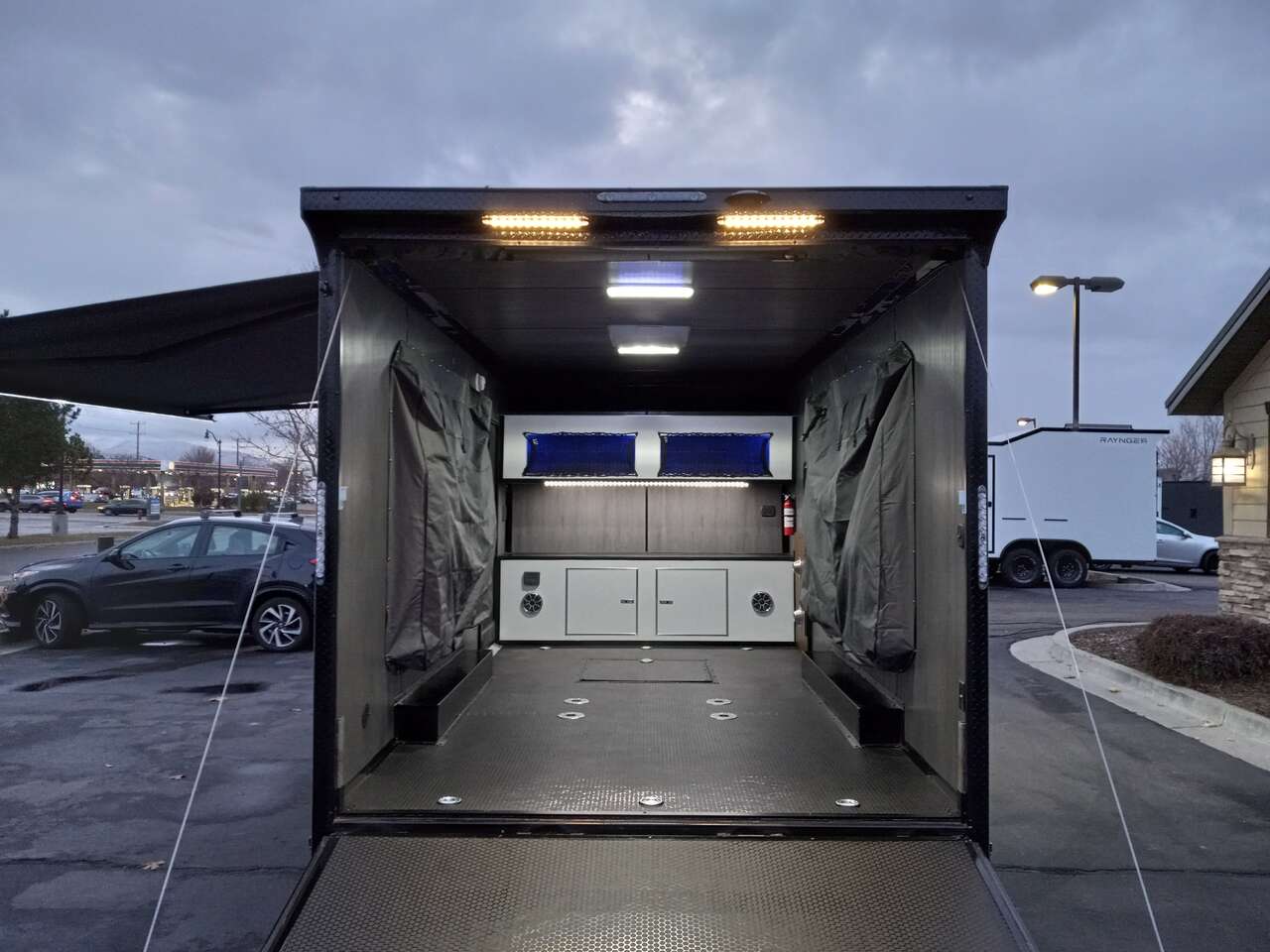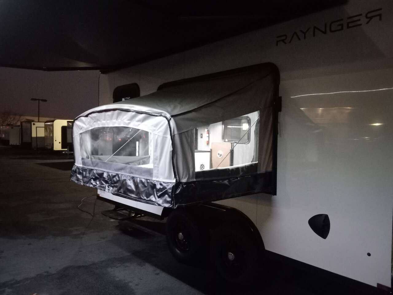 LIMITED TIME $259 A MONTH WITH ZERO DOWN WITH OUR SPECIAL LOCAL CREDIT UNION PARTNER!!! NO PRE-PAYMENT PENALTIES!!! NEW 8.5 WIDE MODEL!!! WILL FIT ANY STOCK SIDE BY SIDE UTV!!! RAYNGER PREMIUM OFF ROAD TOY HAULER CAMPER!!! 18 INCH GROUND CLEARANCE!!! OFF ROAD TIRES!!! FULLY INSULATED!!! HEATING AND A/C!!! WET SOUND STEREO!!! TWO FOLD OUT/POP OUT TENTS WITH MATTRESS!!! CARGO BASKET!!! LED LIT AWNING!!! 87 Inch Rear Entry Height/90 INCH INTERIOR HEIGHT!!! 90 Inch Rear Entry Width!!! Aluminum Ventilated Locking Generator Box!!! UPGRADED 5,200# TORSION AXLES!!! 14.2 Foot Long Garage Space!!! And Much MUCH MORE!!! Check out our Specs!!! Also available in 18 foot models. 18 Foot Models can have 3 Fold Out Beds/Pop Out Tents. 16 Foot and 18 Foot Models will fit ANY stock 4 Seater Side by Side • 6” I Beam Frame• Flat Top Design• Flat Front Design• Wall Posts 16” on Center• Cross Members 16” on Center• Roof Bows 16” on Center• Rust Inhibiting Z-Tech Protection on Chassis• Ameraguard on Tongue• Ameraguard on Rear Bumper• Ameraguard Around All Door Openings and Stepwell• Ameraguard Around Edges of Ramp Door• 3500 LB Spring Axles• 2-5/16” Coupler• One-Piece Aluminum Roof• ST235/75R15 Aluminum Wheels with Chrome Center Caps• 2000# Ramp Door with Eberhard Latch• 30” Tempered Glass RV Door with Screen Door• .030 Exterior Metal with Screwless Sides• 24” Black Stoneguard• 3” Black Bottom Trim• Sand Pad• Black Door Hold• 2.7mm Charcoal Textured Vinyl Ceiling • 9mm Charcoal Textured Vinyl Walls• 3/4” Engineered Wood Floor with Rubber Coin Overlay• (6) 1200 LB Floor D rings Installed with Backer Plates• LED Clearance Lights and Tail Lights• LED Back-up Lights• No Show Wheel Box• Spoiler with Toggle Switch• RV Step• 7’ Interior• (2) 17” Chrome Base Lights with Switch• (1) Black 17” Spot Light with Switch• (1) 30 Amp Panel with Marine Plug• A/C Unit with Heat Strip• (3) Interior Recepts• (1) Exterior Recept• 12V Battery and Charge Line• Prep for Backup Camera• Wet Sounds System• (3) Blue Interior Cabinet Lights• (1) 6’ Section of Flex Lights• Black ATP Rear Header and Hoop• Black ATP Fenders• Insulated Walls & Ceiling• Base Cabinets• Overhead Cabinets with Netting Over Compartments• Pop Out Tent• Black ATP Storage/Generator Box Mounted On Tongue SW094231 SW094231