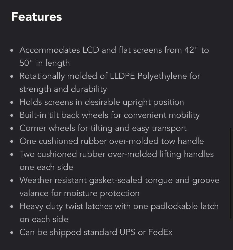 Description- FP Series 4250 rolling, padded, locking hardshell TV travel/shipping case for 42”-50” TVs See photos for more product information and specifications.