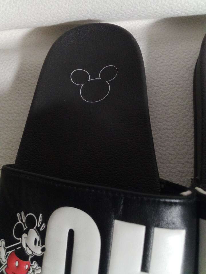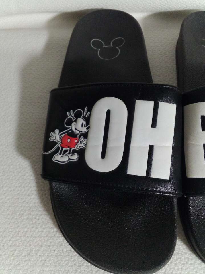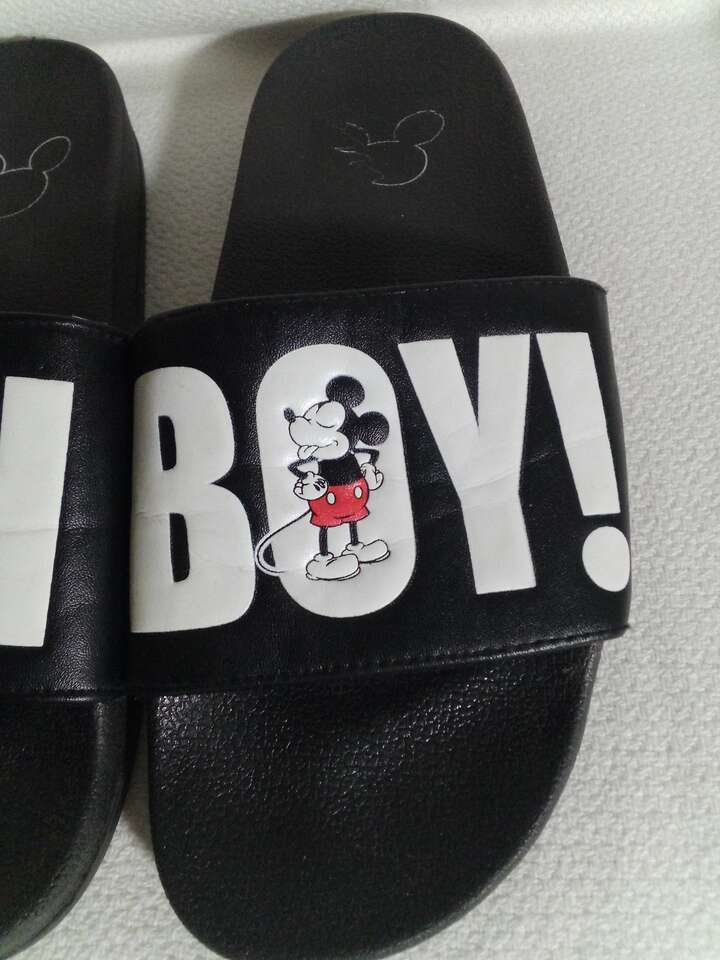 Slip into the world of Disney with these extra cushioned Mickey Mouse "Oh Boy" slippers. The black slippers feature a solid pattern and are made of polyester with a polyurethane insole for added comfort. They are part of the Disney product line and are perfect for any fan of Mickey Mouse. They come in size 9 for men. The slippers are perfect for any occasion and will add a touch of Disney magic to any outfit. Get ready to show off your love for Mickey Mouse with these stylish and comfortable slippers.