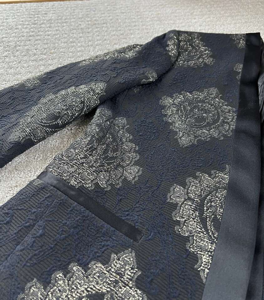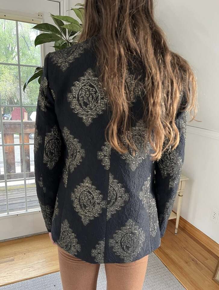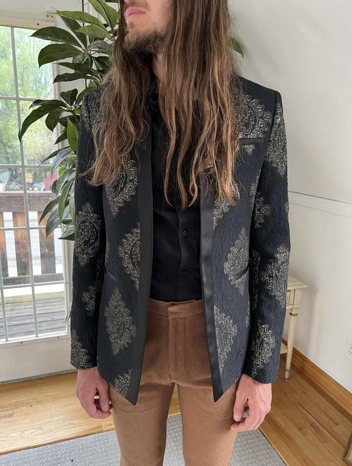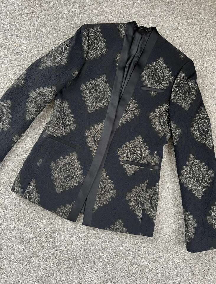 VenmoMen’s ASOS Blazer Size 36” Regular Worn once, basically new This is my favorite blazer of my husband’s, but he doesn’t dress up. It’s super unique. It mostly just looks black and gold on, but it has some dark blue embroidery in it as well. Cash or Venmo. Will hold with Venmo payment.