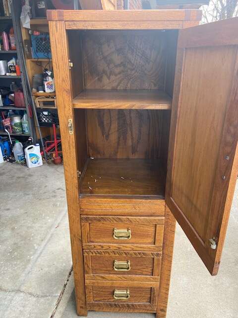 OAK DESK WITH HUTCH, CHAIR AND CABINET WITH SHELF AND DRAWERS
