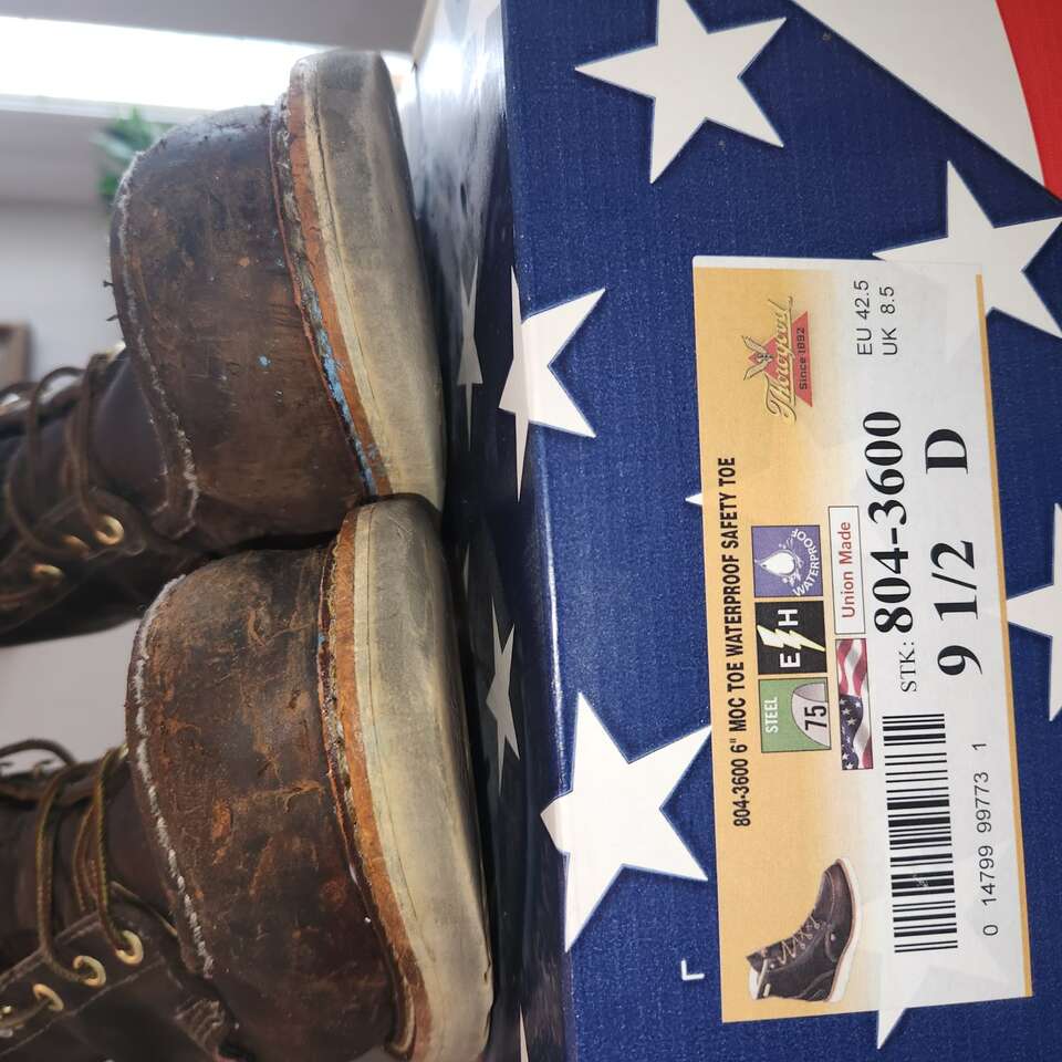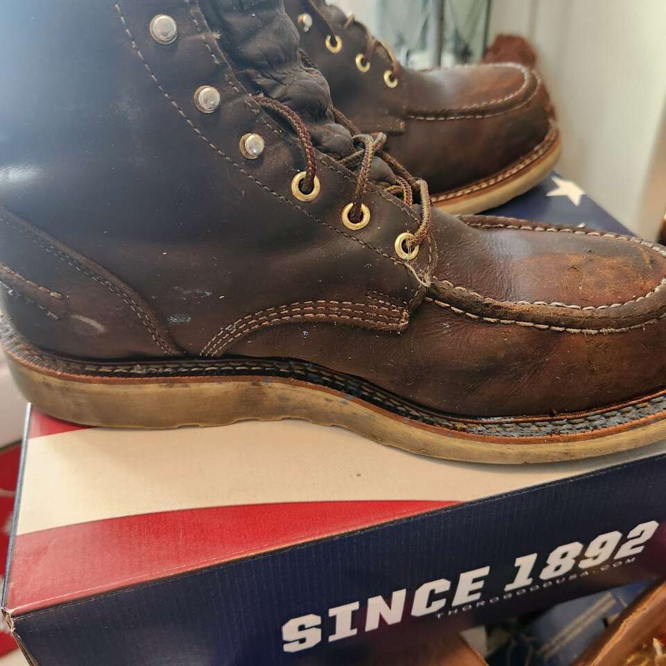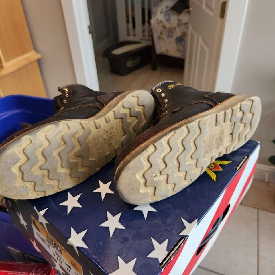 nice pair of Thorogood work boots, used, but in great shape. these do show signs of use, I see some scrapes and paint. but these look great and I loved wearing them. these are a expense , well built boot. I just dont need these anymore. Someone else should have them. waterproofing applied recently.