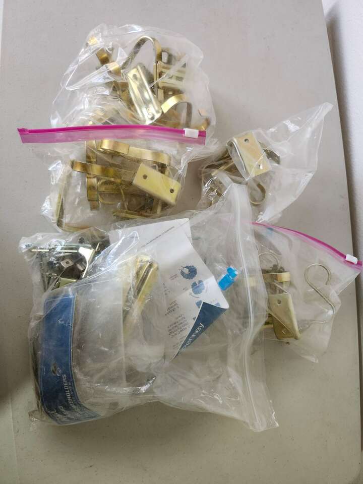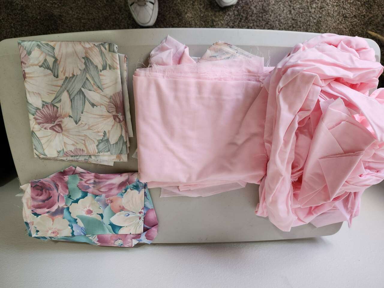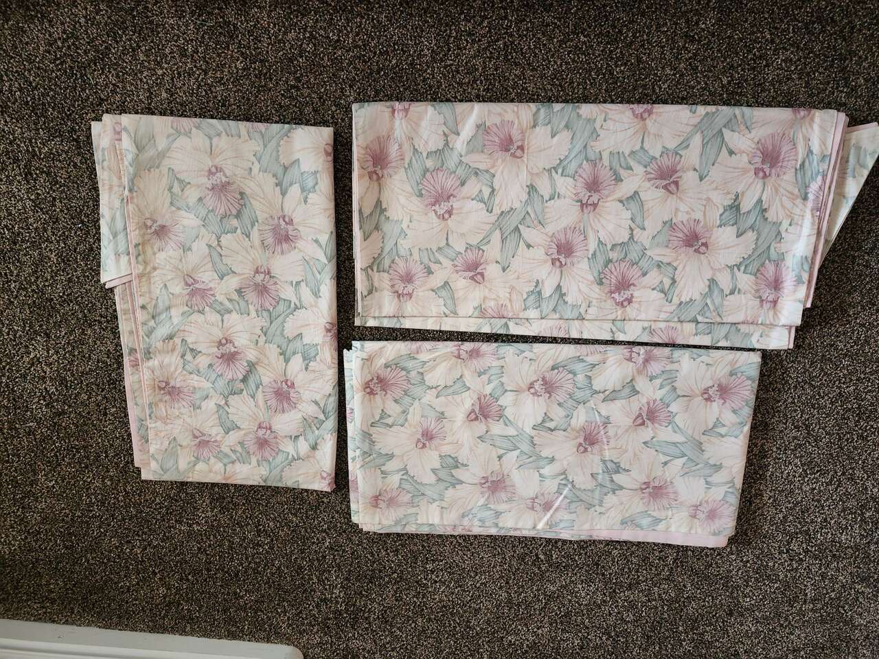 Venmo3 seperate 'lined' drapery panels in light pastel colors measuring 268.9"x26.9",180.9"x26.9" & 174.11"x26.9" equalling a total of 51ft x 26.9" wide; misc material pieces as well as 'lining' pieces. Also includes mounting hardware