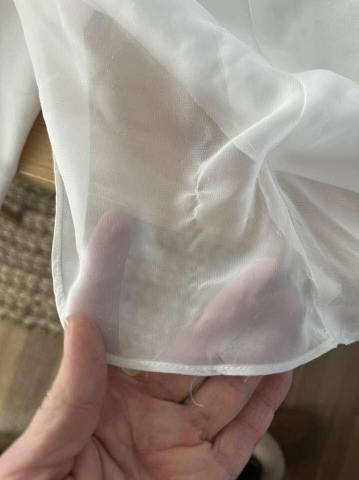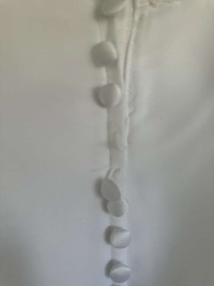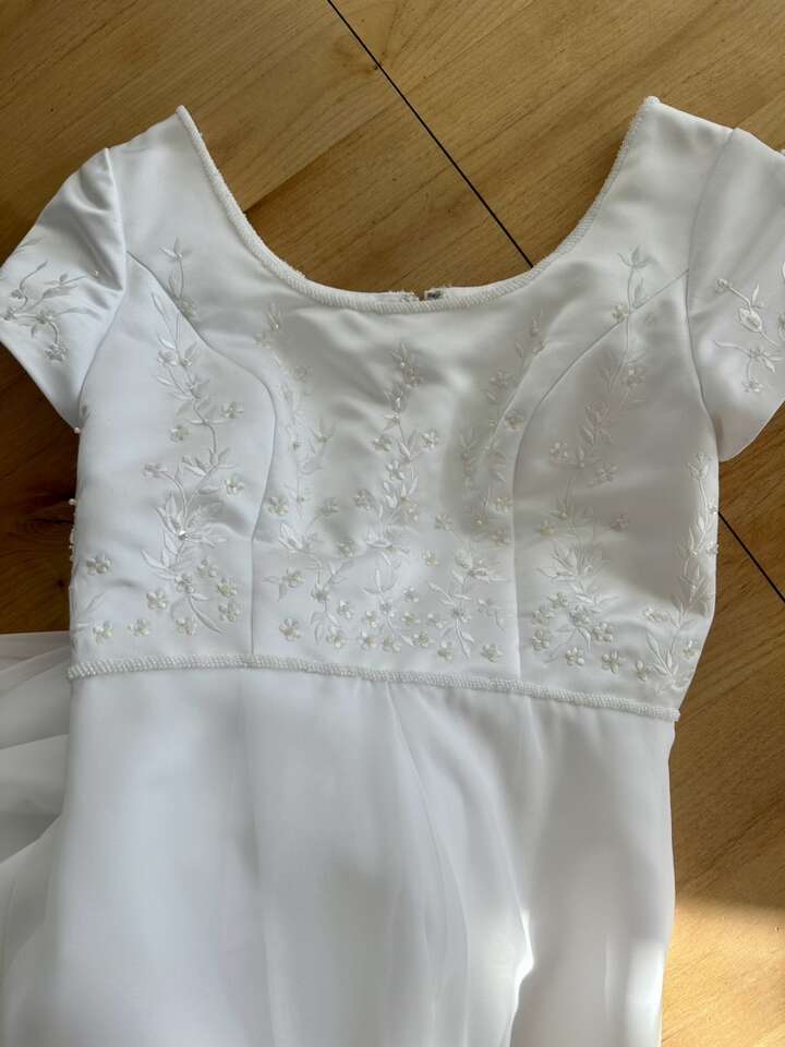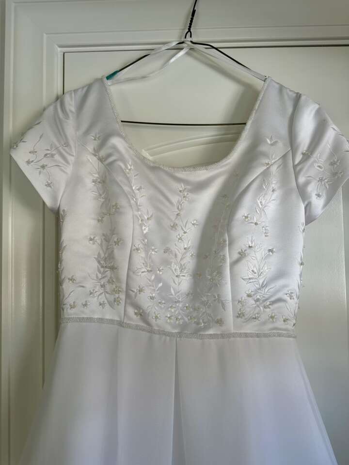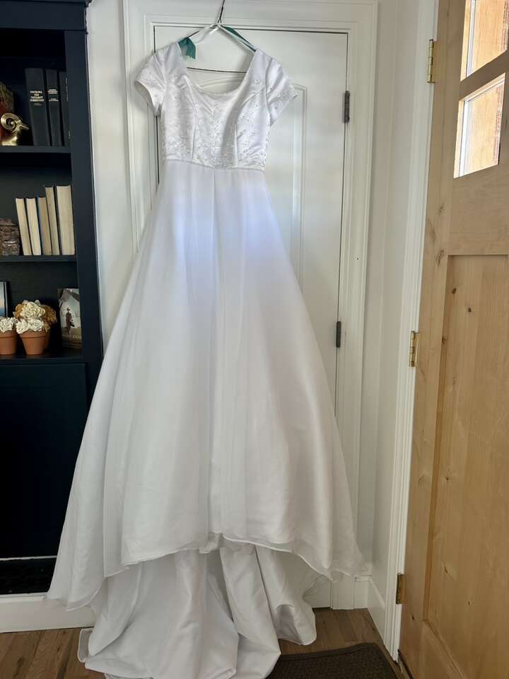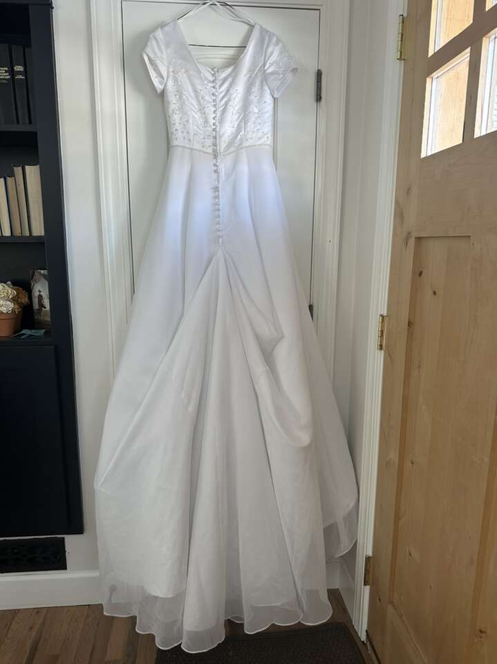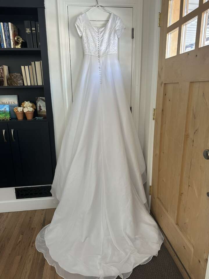 ApplePayPretty white wedding dress. Beaded top. Pleat in the front. Train in the back. Modest. Size 6. Tulle underneath for fullness. Has 3 tiny stains near the bottom in the back and one spot at the bottom edge with some gathering. It is missing one button in the back and the button below the missing one is loose. Other than that, in great condition. From a smoke-free, pet-free home.