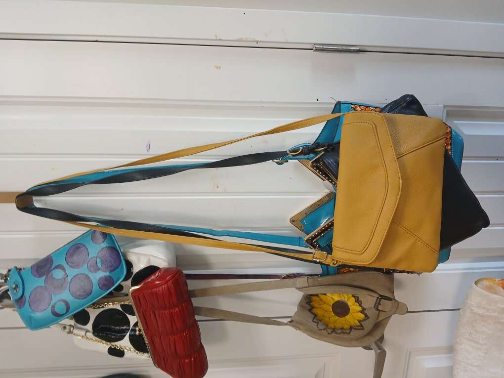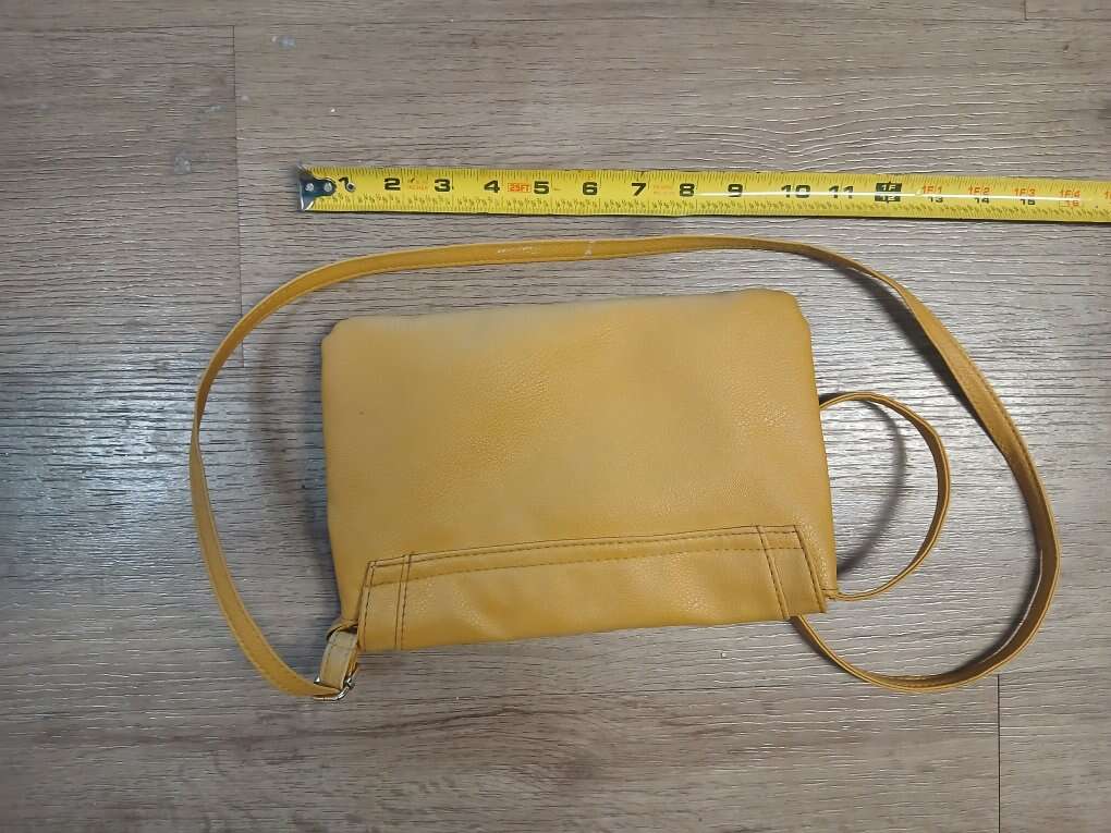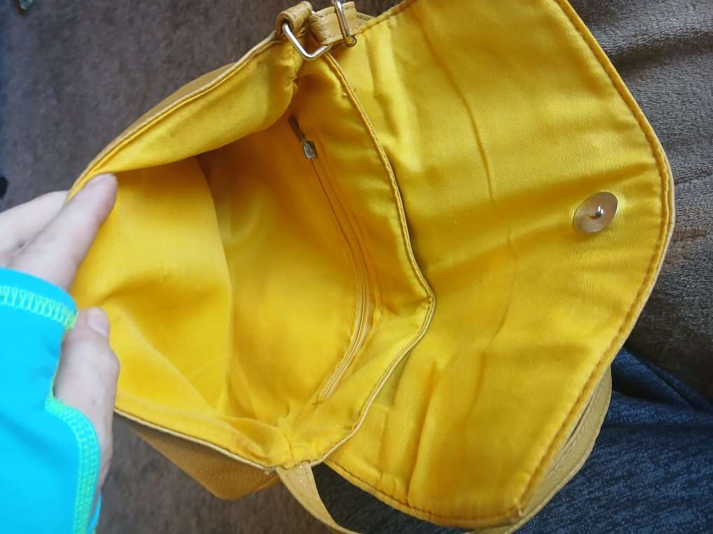 Magnetic snap closure, adjustable crossbody strap. Yellow liner, zip pocket inside.