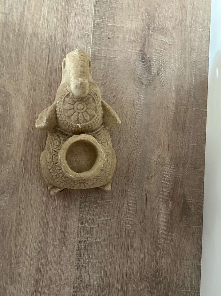 Sandstone elephant decoration You can put a small candles, jewelry, etc on its back. Height: approximately 6” Length: a bit under 7” Used but in great condition, nothing was stored in its back “bowl”