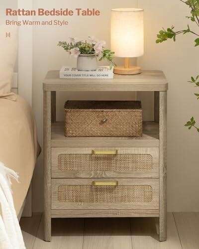Retailer's Title: SHEEPPING Rattan Nightstand with 2 Drawers - Boho Bedside Table, Farmhouse Night Stand with Open Storage Shelf, Wood End Table Side Table for Bedroom, Natural