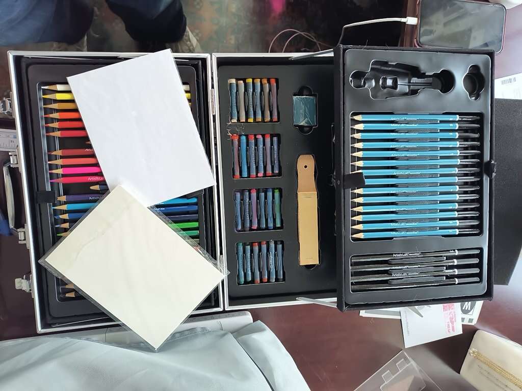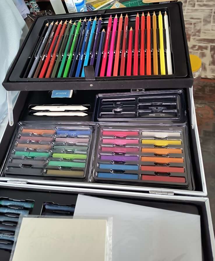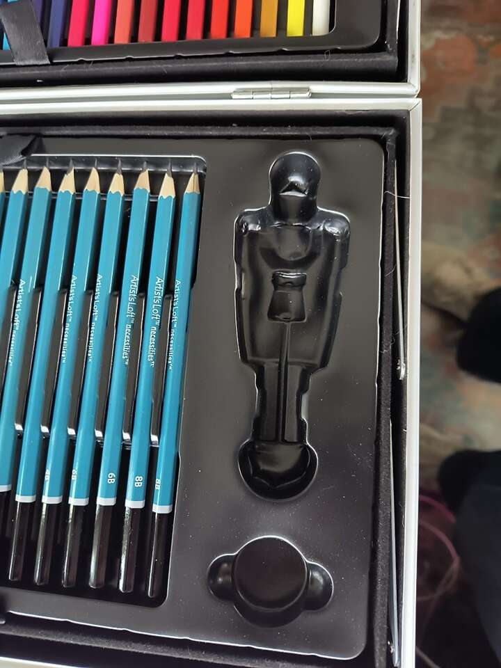 missing the wooden model, and one chalk black color I believe is B1. I used some of the pencils but other than that In a very good condition. cleaning my art supplies