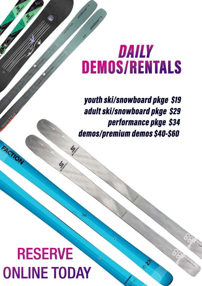 Whether you are planning in advance or the day before, you'll find great skis, snowboards, and demos. Please note: we do not require reservations to rent equipment, however, it is recommended.