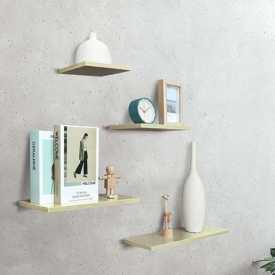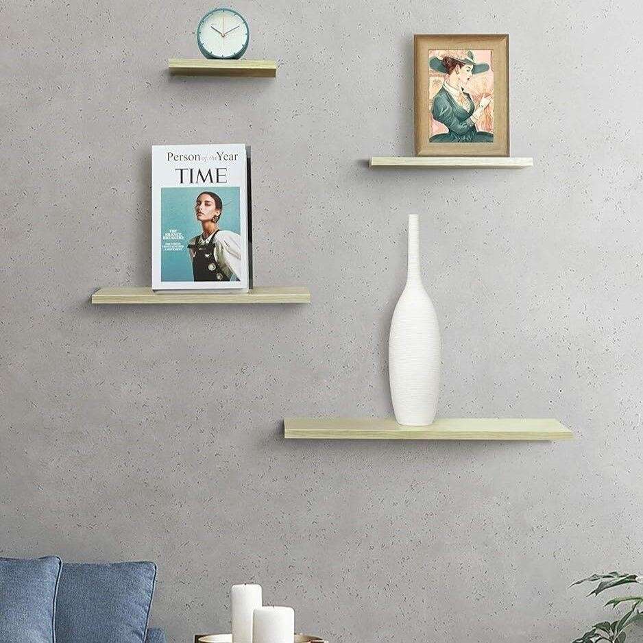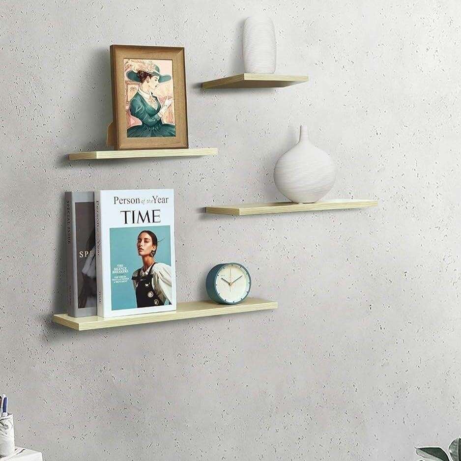 Retailer's Title: Shantton Floating Shelves Wall Mounted Set of 4 Wall Decor Wood Display Storage Shelf Rack for Bedroom Kitchen Living Room Entryway Hallway Maple Minimalist Design