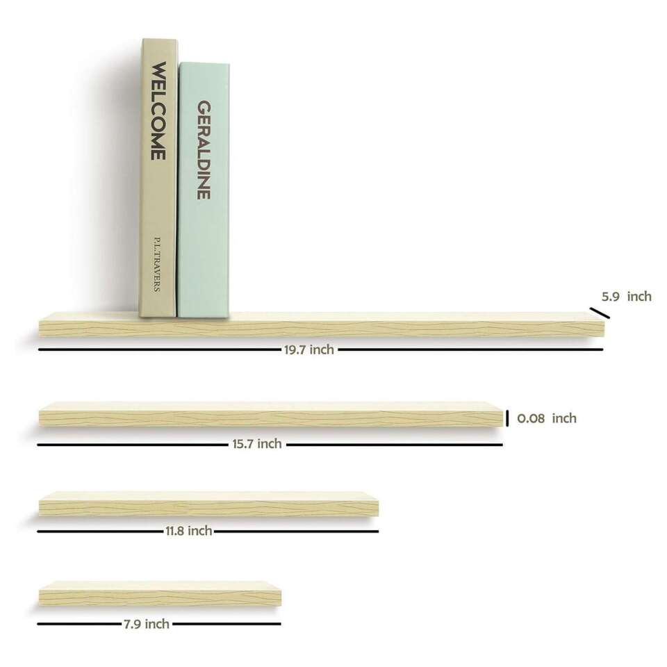 Retailer's Description: Here presents to you the multi-purpose and supreme quality floating shelves! This product allows for the efficient use of your wall-space. The package includes 4 sizes shelves: 19.7’’, 15.7’’, 11.8’’ and 7.9’’.