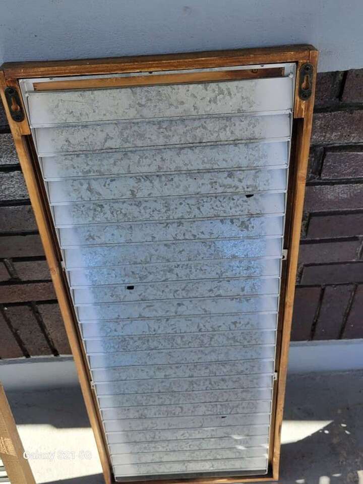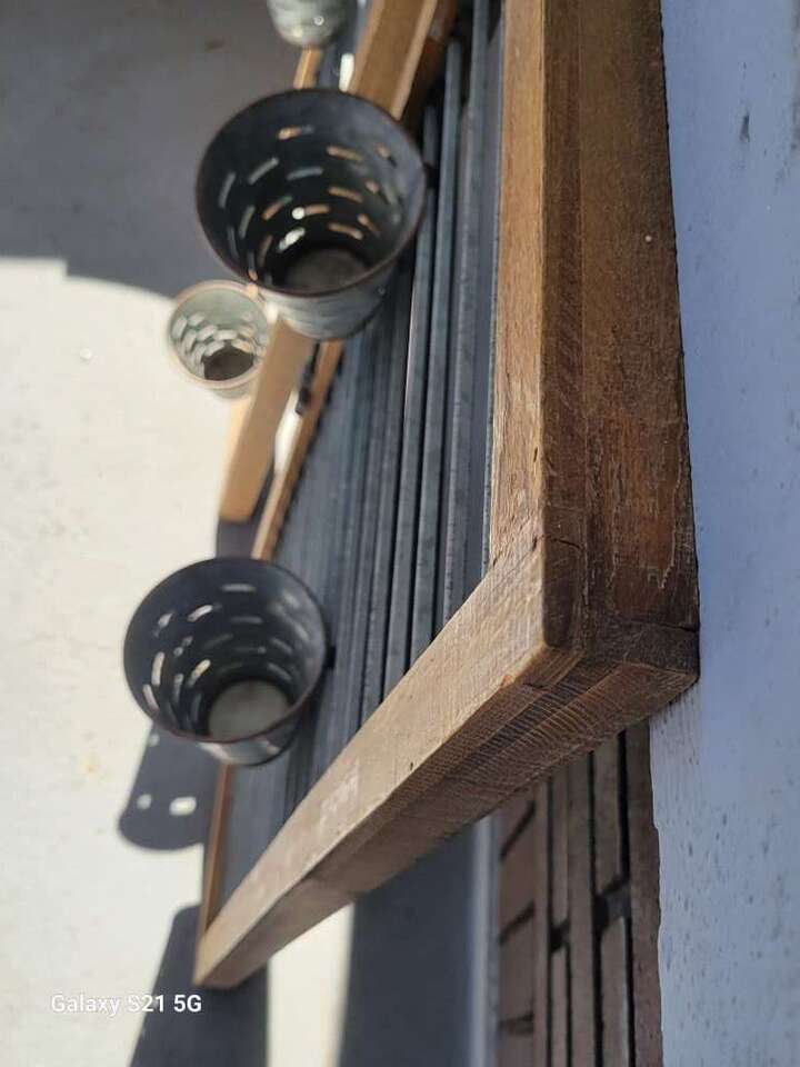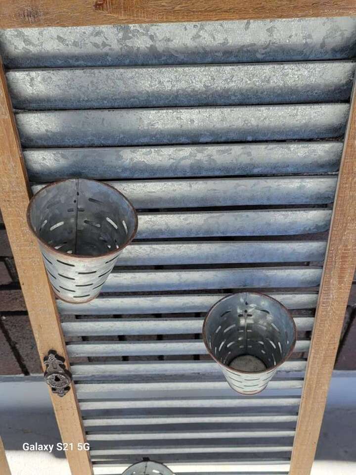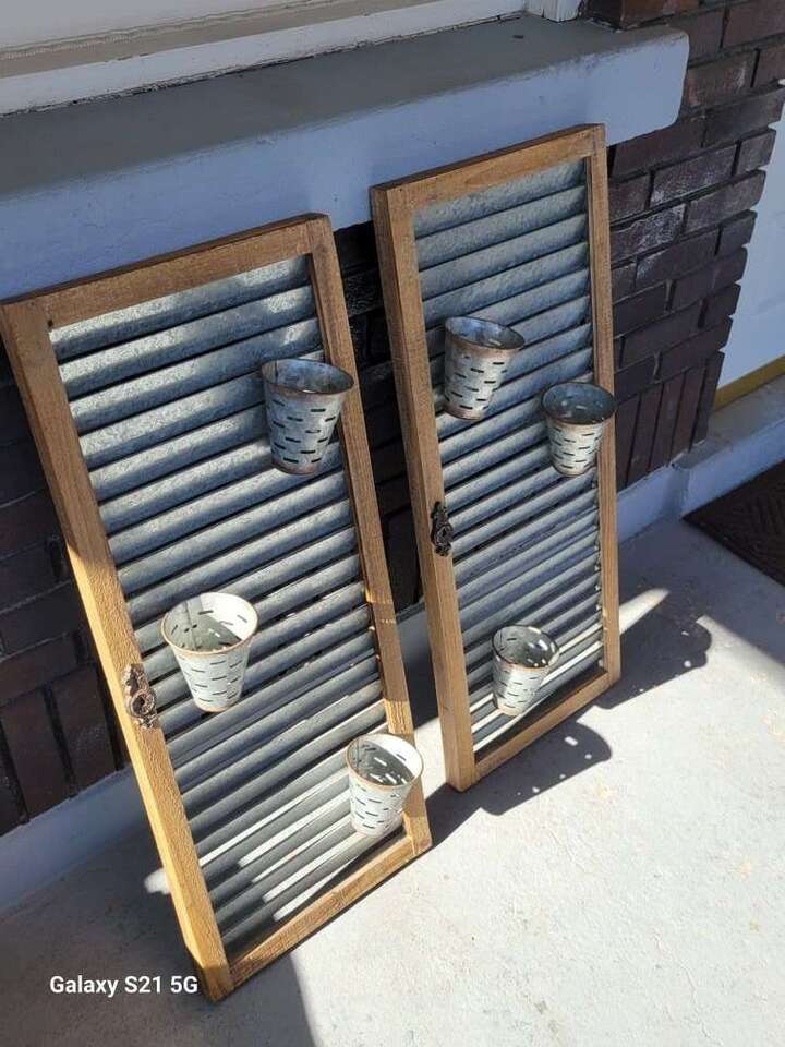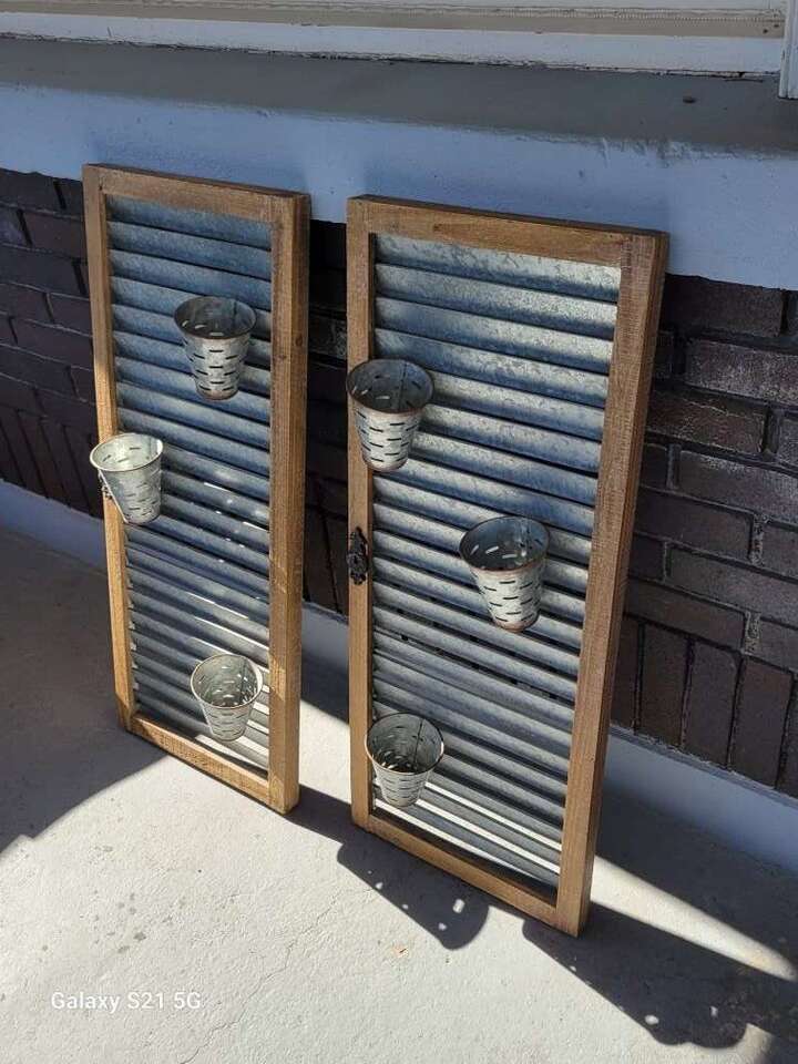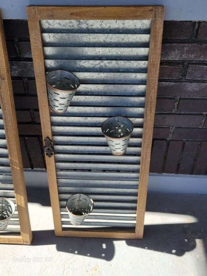 Galvanized Steel and wood hanging Shutter style planters. Approx 36Lx15Wx1.5D (5" Depth with the planter cups attatched. Rustic and well used. clean and used for inside decor. Price is firm. Item in Provo, cash and pick up only, sry no venmo, please see my other listings, thanks