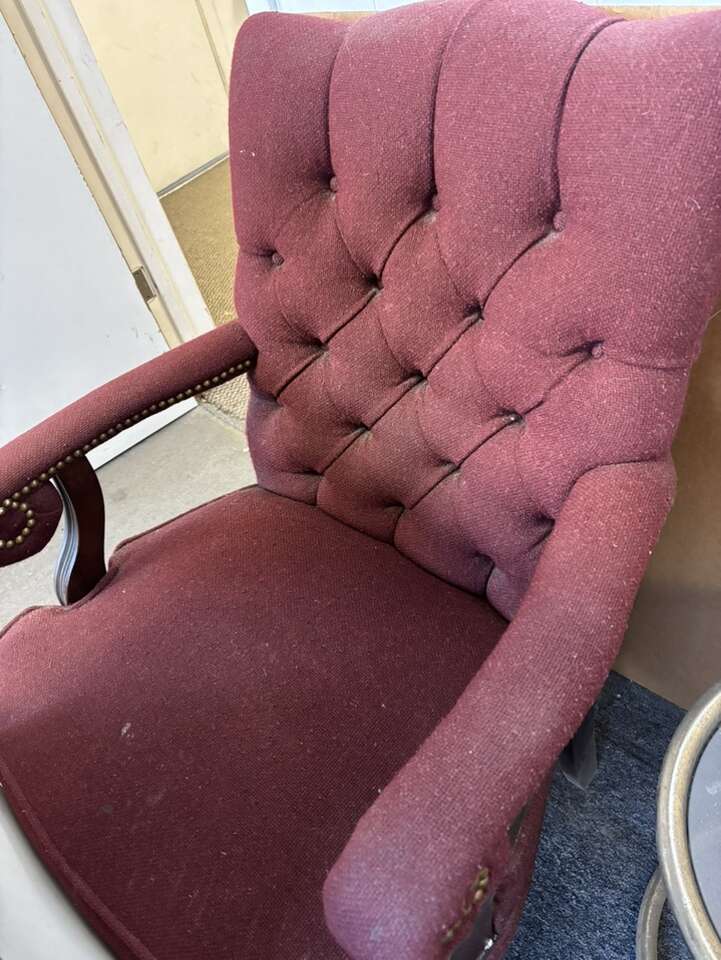 Maroon side chairs. One is in better shape than the other one. One has a spill spot that needs to be cleaned. $5.00 ea.