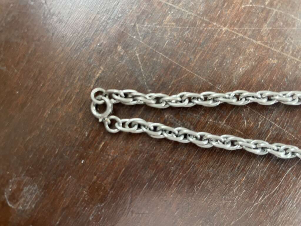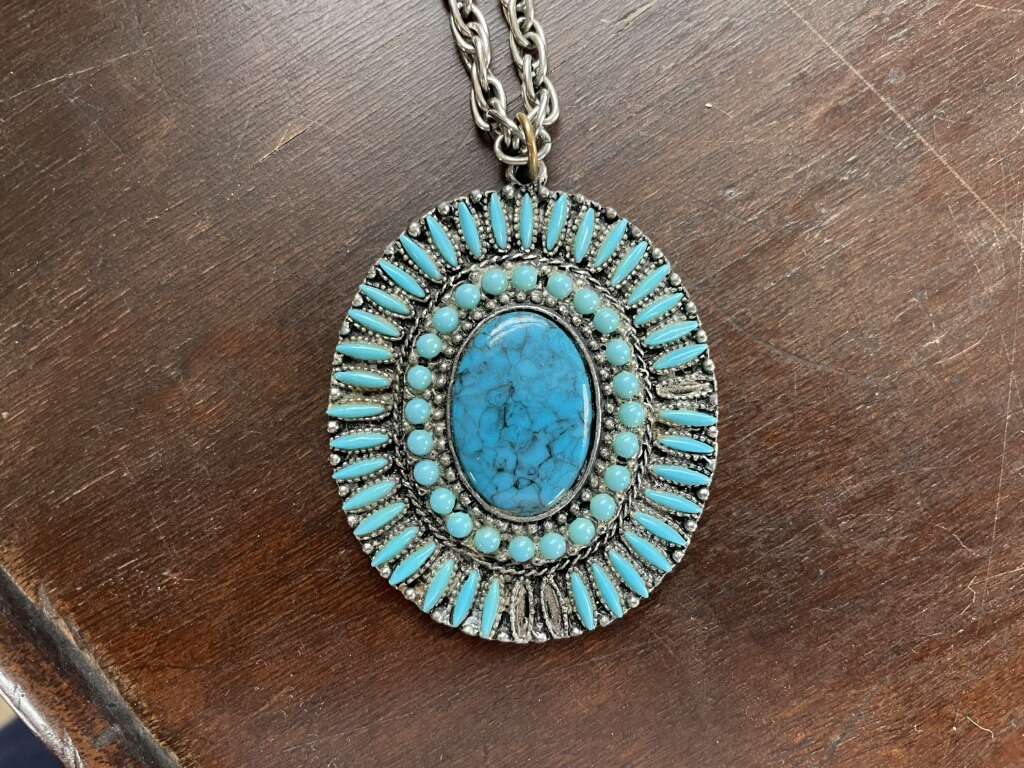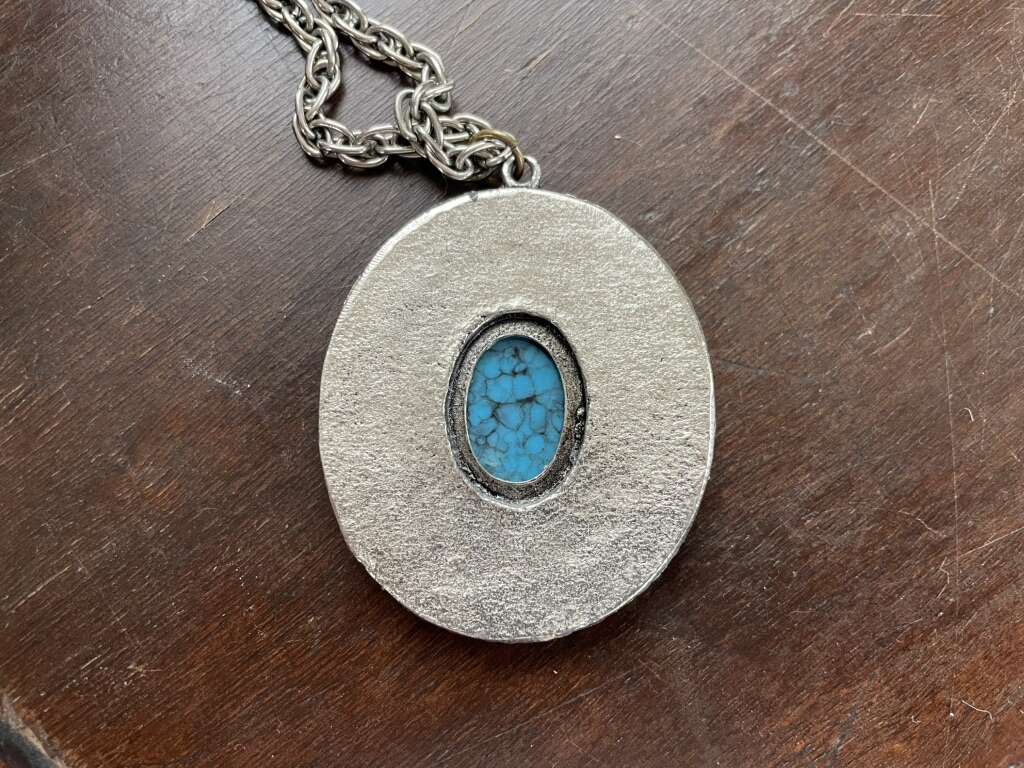 I have a large faux turquoise pendant on a silver tone chain. I’m not sure if it was purchased in the 1970s or 1980s. The large center stone has a lot of veining but is smooth so I’m assuming it’s not real. A couple of the small stones on the outer ring are missing but aren’t very noticeable. The chain is not real silver but is nice and thick. The chain is 24 inches long and the pendant is 2 1/4 inches long. See my other ads for jewelry, artwork, home decor and more.
