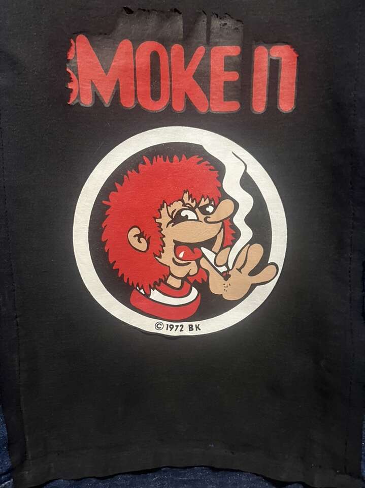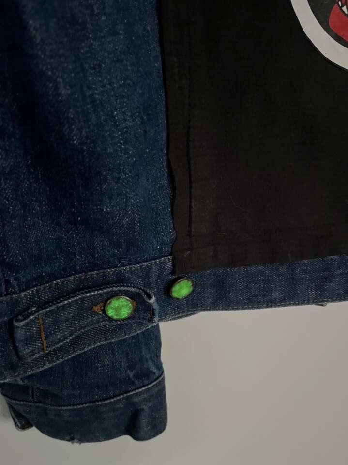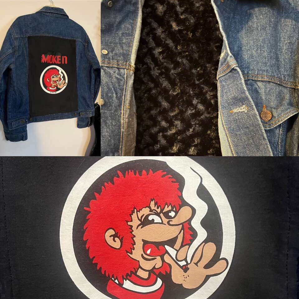 VenmoLg unisex denim jacket with vintage “Smoke it” decal. Lined with super soft black material for warmth and comfort. Back and sleeve buttons glow green in the dark. Be one of a kind.