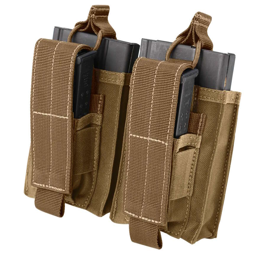 For those who prefer a kangaroo-style mag pouch, Condor's got you covered. The KAP (Kangoroo Ambidextrous Pouch) is designed to be worn front-facing or back-facing on a modular system. With two overlapping mag pockets, inside adjustable compression straps keep your magazines secure. The outside features heavy-duty, dual density, non-slip lining as well as room for accessories like a windmeter and multitool. Condor's latest innovation, the Kydex KAP (Kangaroo Ambidextrous Pouch), does away with the traditional belt loop and instead relies on the users' choice of a webbing or elastic method of attaching to the KAP. Condor's new KAP solves the "for what if" scenario by allowing the user to remove the KAP without having to remove the KAP first. By removing the kangaroo pocket first, users have gotten a larger, more stable platform to position their magazines. Also, the Kydex back panel can be used for other mission essential tasks such as storing energy gels or converting the KAP to a traditional ammo pouch. Using the Condor KAP, one can keep his magazines raised to maximize the effective range of his mags. Specifications for Condor Outdoor Double Kangaroo M14 Mag Pouch: Manufacturer: Condor Outdoor # of Mag Pouch Compartments: 2 # of Mags Held in Each Compartment: 1 Size: 4.75H x 7W x 1D in Accessory Attachment System: MOLLE Gun Model: M14 Package Contents: Condor Outdoor Double Kangaroo M14 Mag Pouch