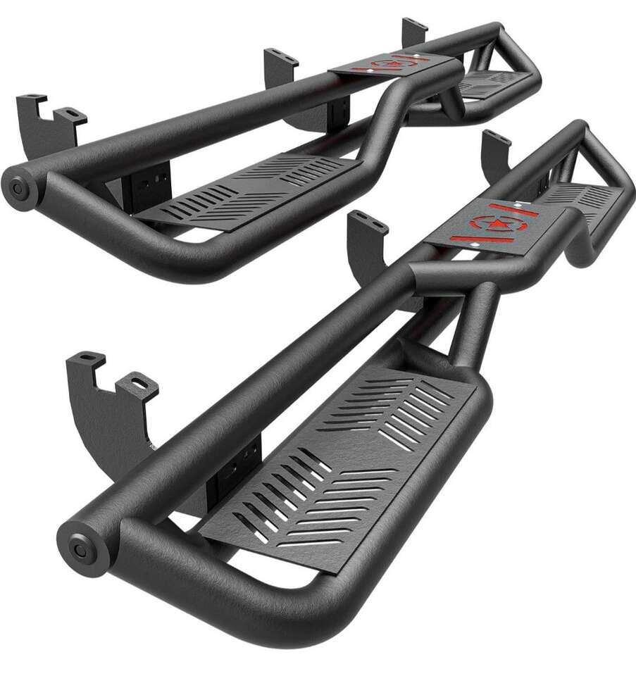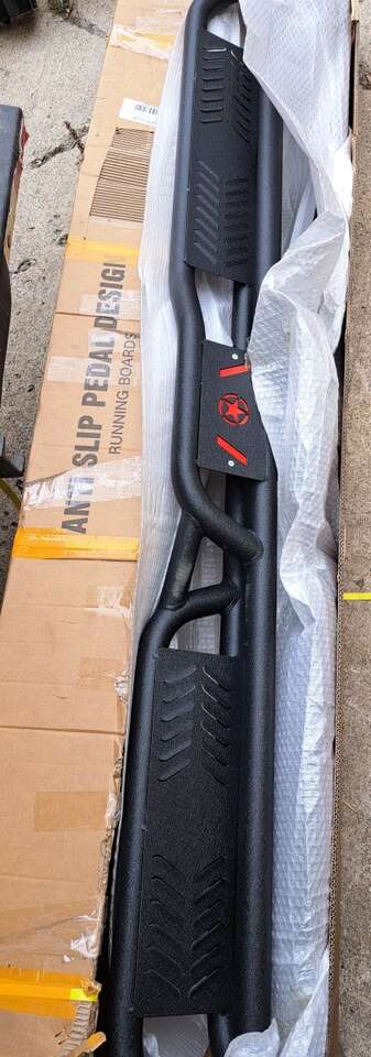 VenmoYZONA part # running-0075, 2 stair desing running boards for toyota tacoma 2024-2025 double cab and crew cab (4 full-size doors) color black, exterior finish black powder coated, weight limit 550 lbs, material carbon steel, heavy duty, $$ 270, new, hardware is included