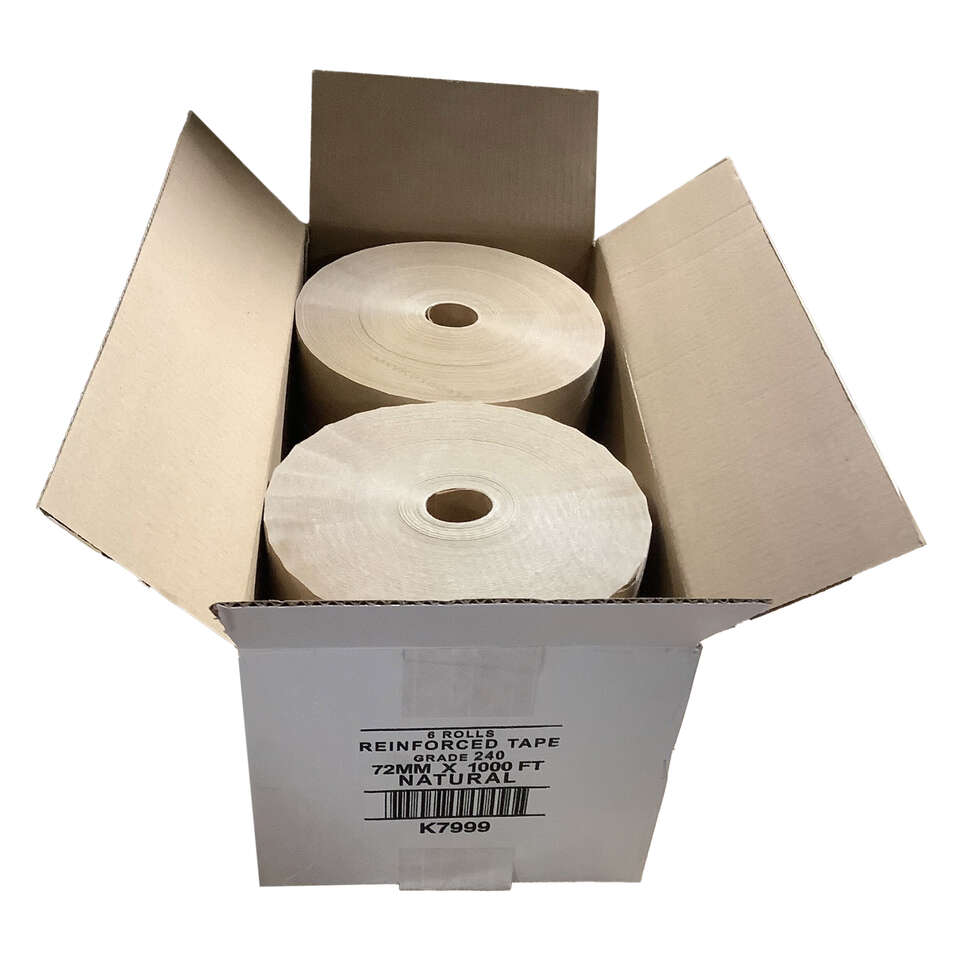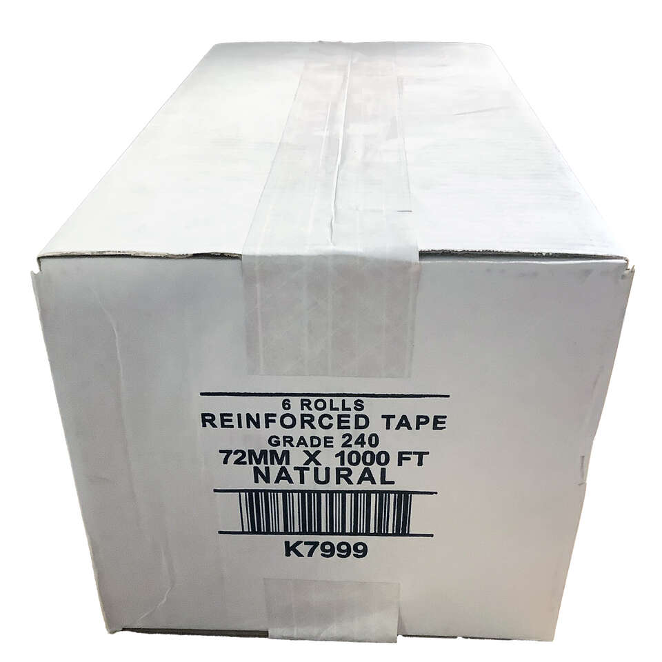 ZelleCentral K7999 #240 grade kraft paper reinforced tape bonds to corrugated boxes when activated by water.