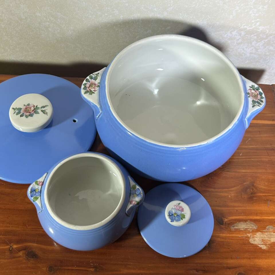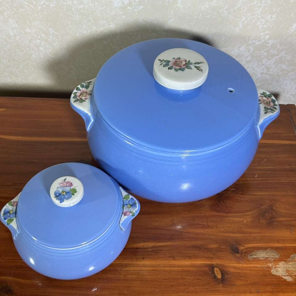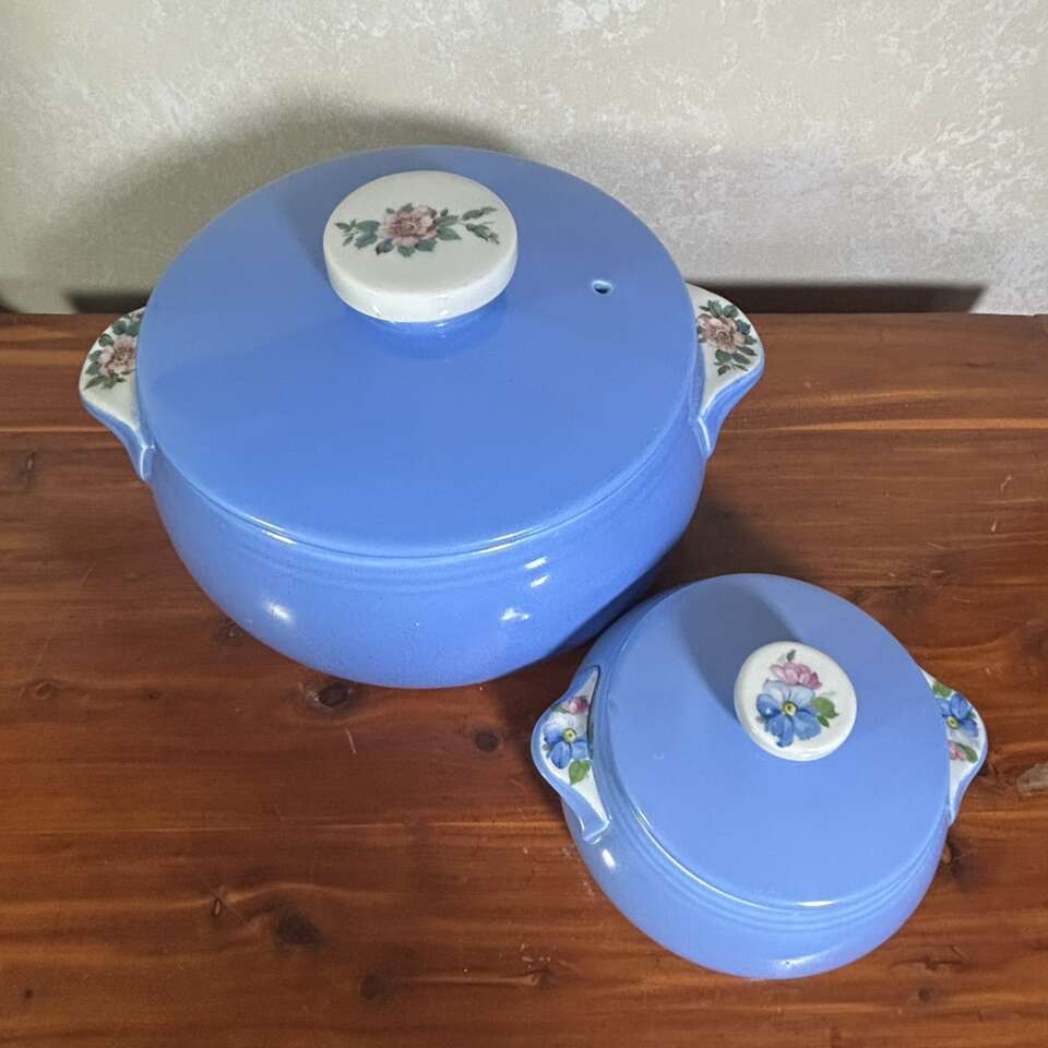 The ceramic dishes are a beautiful sky blue with blossom transfers on all 3 handles (two side handles and single handle on the lid). On heavily used dishes, the gold label on the bottom is severely faded & worn & can be unreadable, but these two casseroles have clear and distinct labels showing they were gently used and may not have been used at all. No chips, cracks, repairs or defects especially no crazing- see why below. In like-new condition.