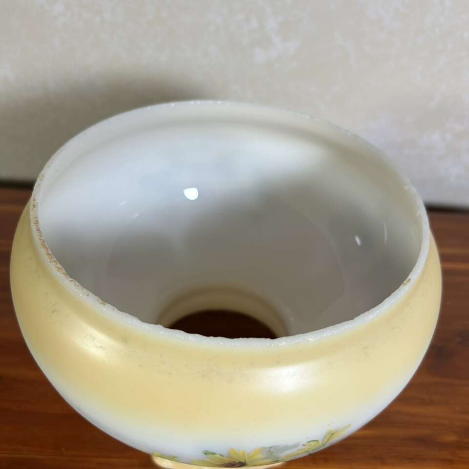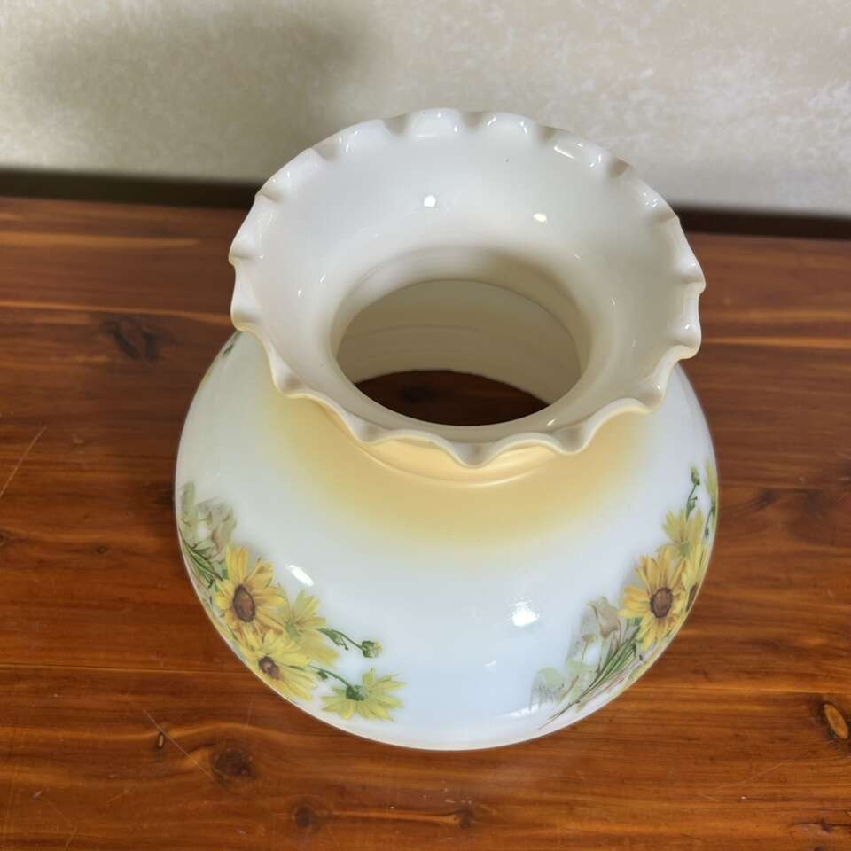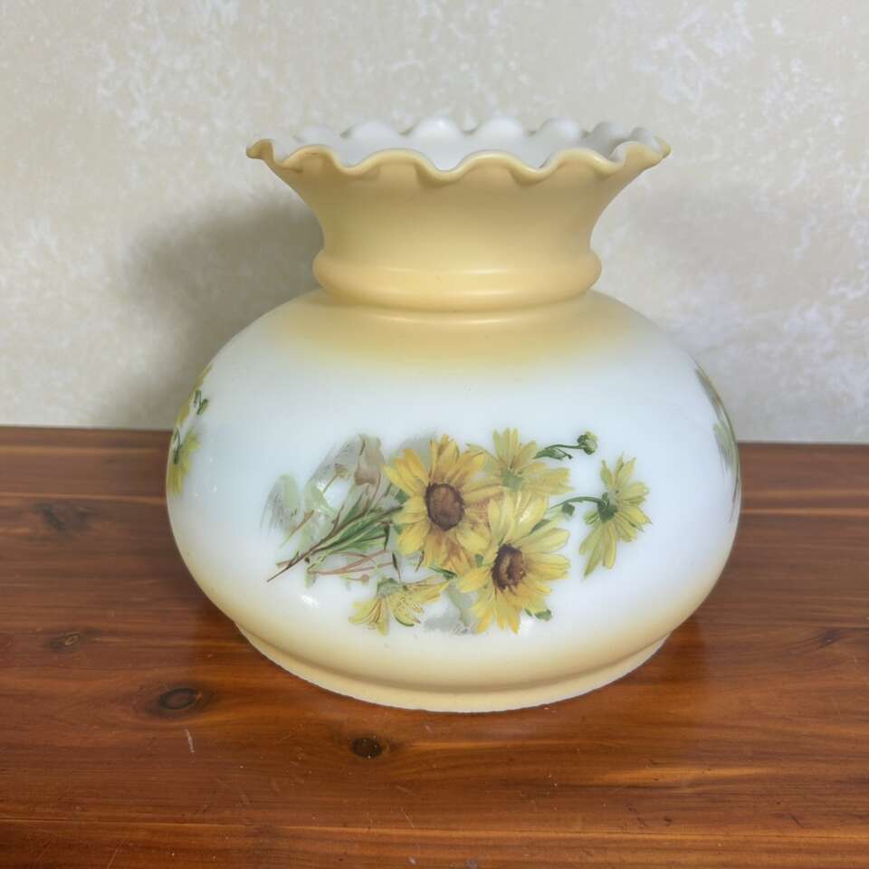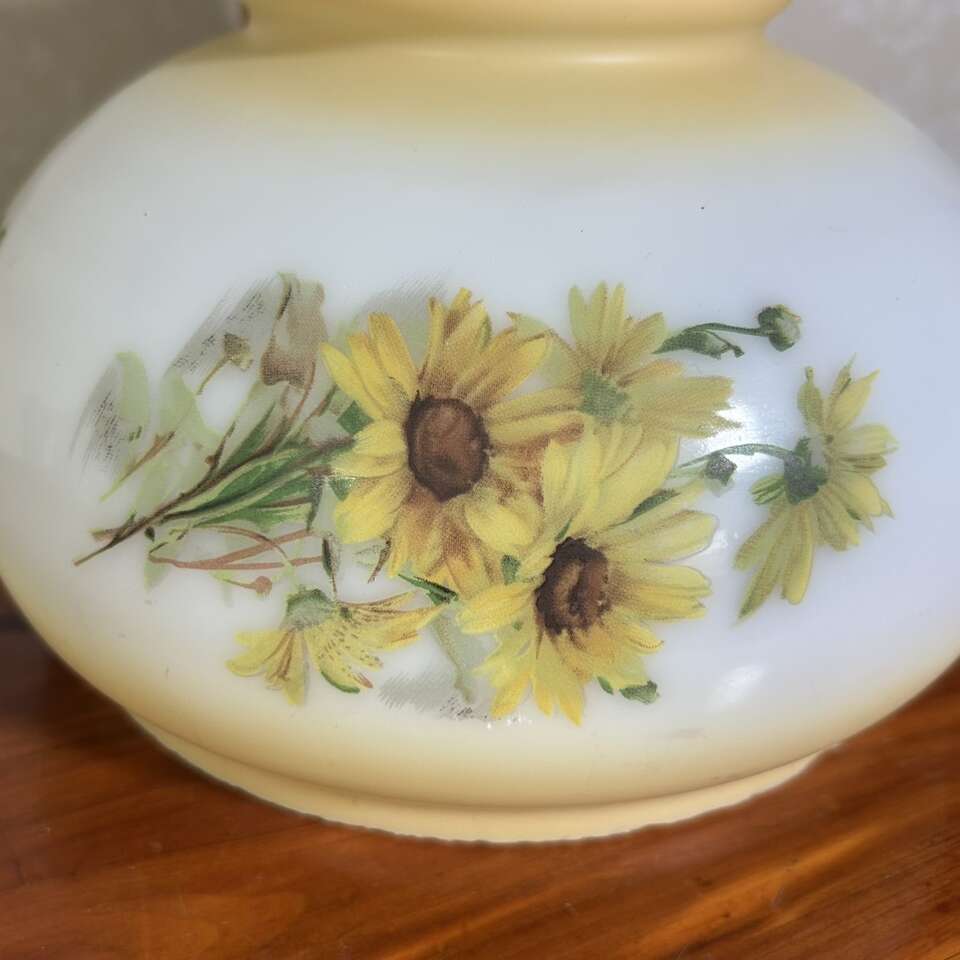 ApplePayVintage Glass Hurricane Lampshade 6.5 fitter that has a lot of tiny chips all along the fitter edge, but they are small, not sharp and you can’t see them unless you’re looking for them, and the are covered eBay the metal fitter of the lamp. The white milk glass has a soft yellow-gold shading on the top and base, and has 4 transfers of cheerful sunflowers. No scratches nor defacements on the designs or shading. Can see metal marks along the lower edge where glass and fitter rub which are also hidden by the lamp’s frame. Nice intact piece of Americana.  No cracks, scratches. Crazing, repairs or defects except for chips already mentioned. Smoke free.