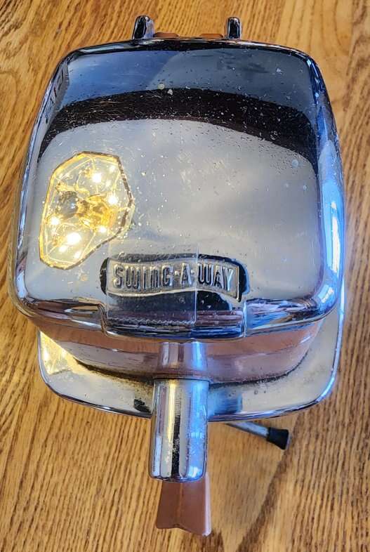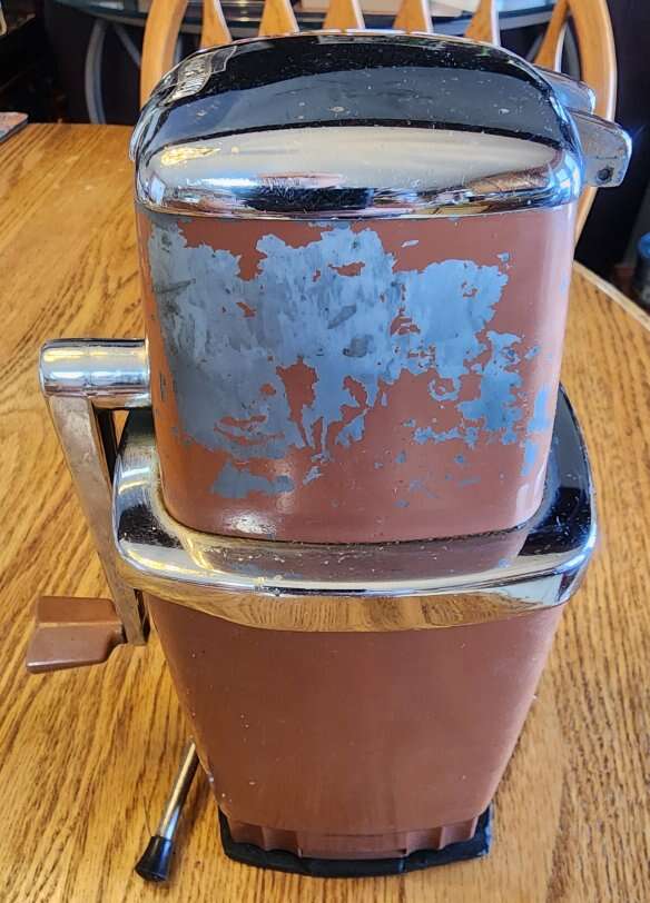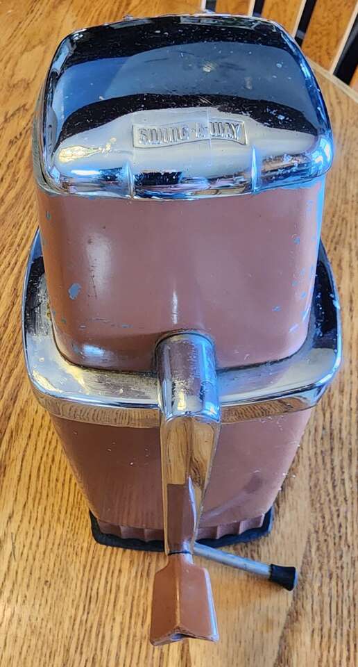 VenmoThis vintage ice crusher top part from Swing-a-way is a must-have for any collector or enthusiast of small kitchen appliances. With its sleek silver color and classic design, it would make a great addition to any kitchen or bar. This item is perfect for anyone who loves to collect unique and functional pieces of vintage kitchenware. The brand, Swing-a-way, is known for its quality and durability, making this ice crusher top part a reliable choice for anyone who wants to make shaved ice at home. Don't miss out on the opportunity to add this rare item to your collection today. This is in good condition, especially for its age. Some paint peeling, and a small dent in the chrome. See pics to clarify.