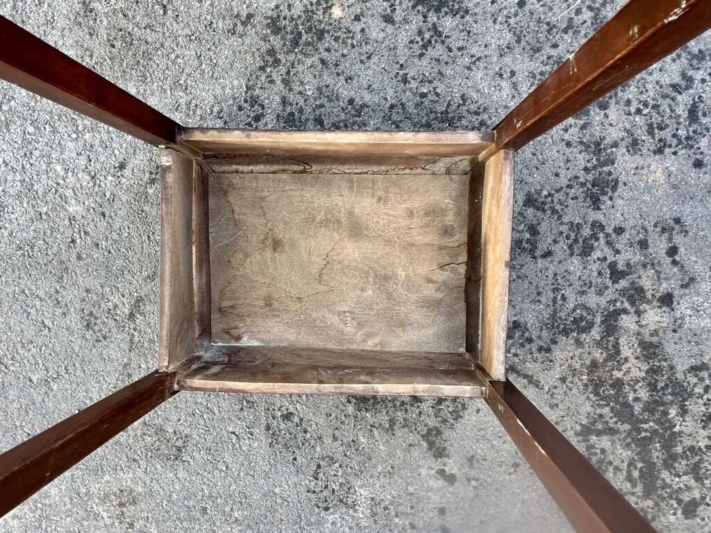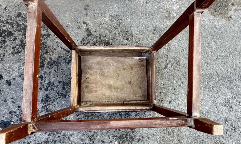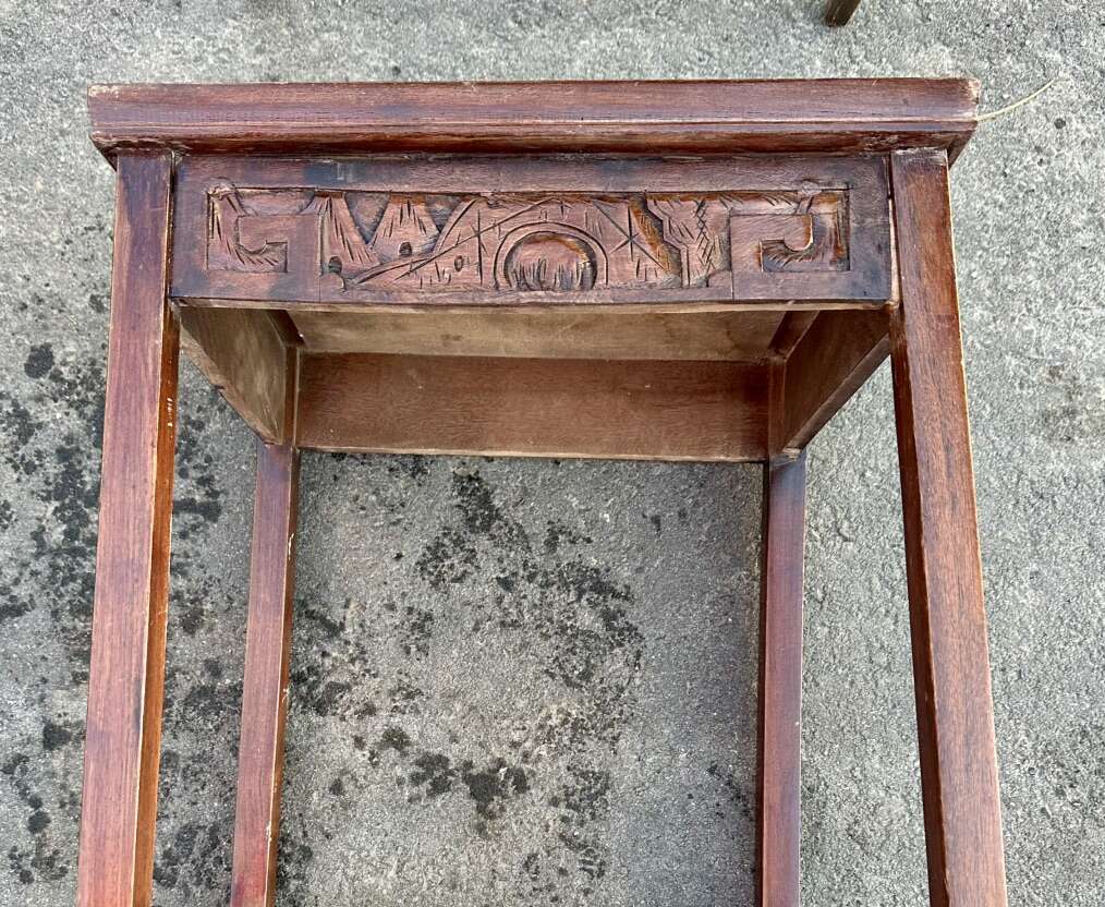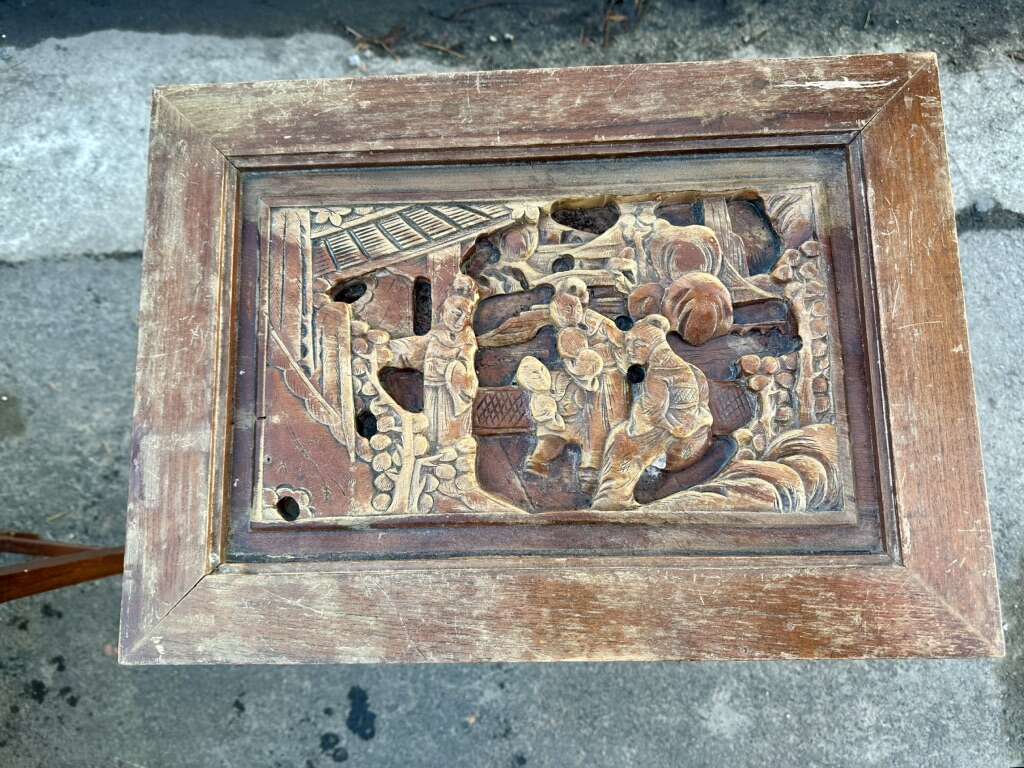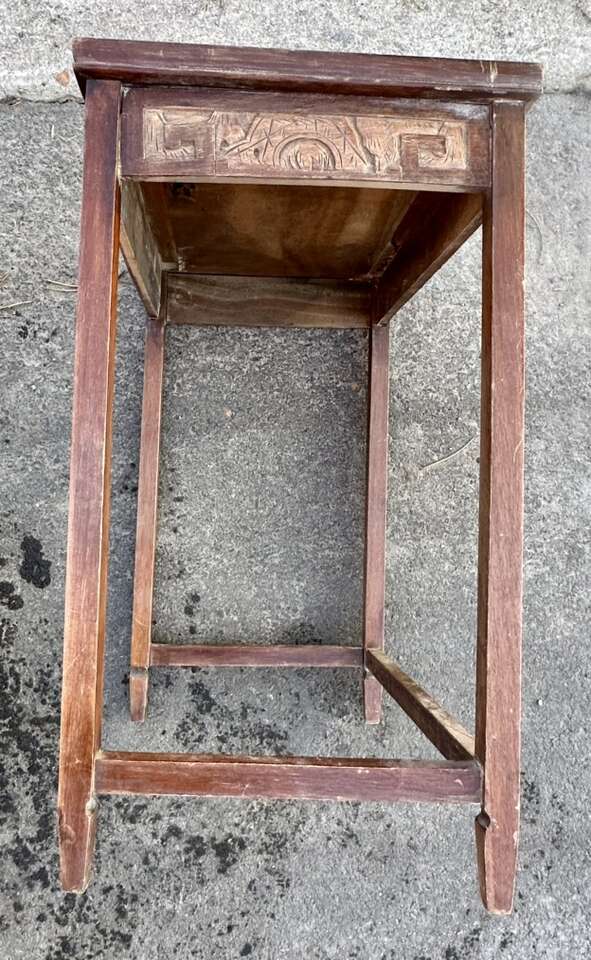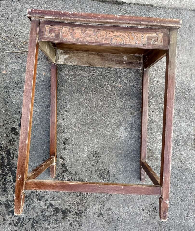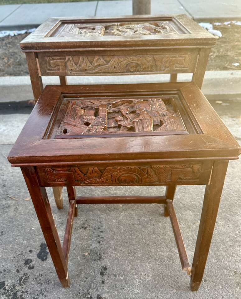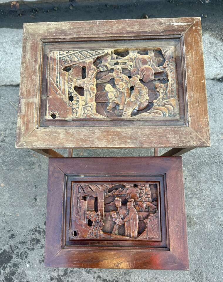 VenmoVintage Asian wood carved end tables for sale. Selling both tables together. Large table has experienced some weathering. Small table is in good condition. No screws were using the construction. Not sure of age. Tables appeared to be older. See photos.