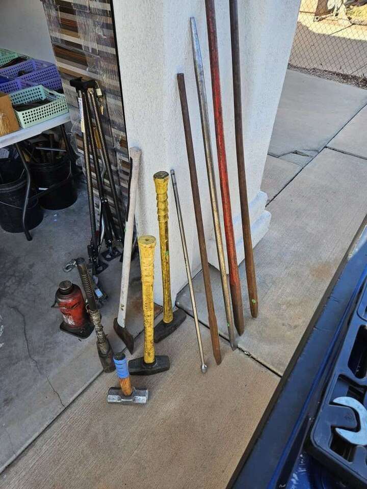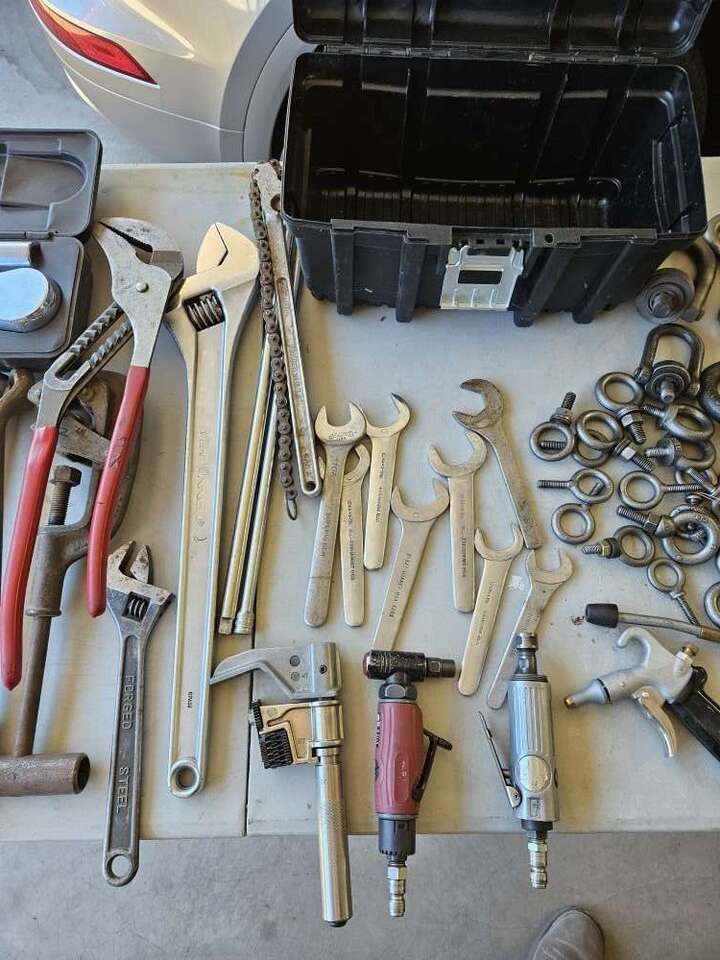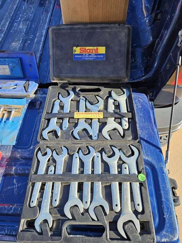 Tools, all types large hammers, bushing drivers, torches all tips, multiple wrenches, large Allen sets, radiator tester, all sorts of hand wrenches, measuring tools, tap/die set's ect.
